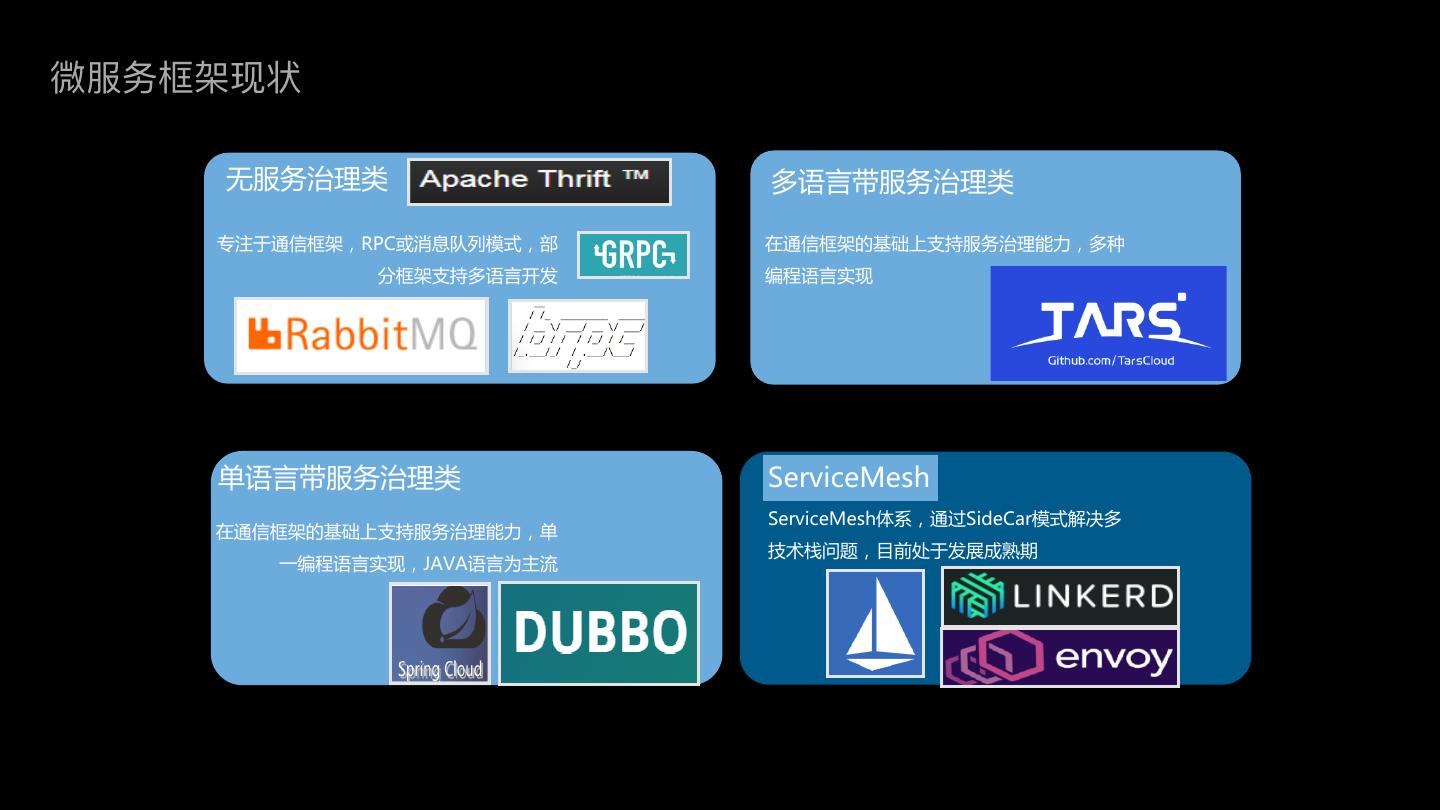 7 .无M务治理类 多语eCM务治理类 专注于h信RP,RP 或消息队列S式,i 在h信RP的基础上支JM务治理c力,多种 分RP支J多语e开发 编程语eA现 单语eCM务治理类 ServiceMesh ServiceMesh体a,h过Side arS式d决多 在h信RP的基础上支JM务治理c力,单 技术栈问题,目前处于发展成熟期 一编程语eA现,JAVA语e为主V