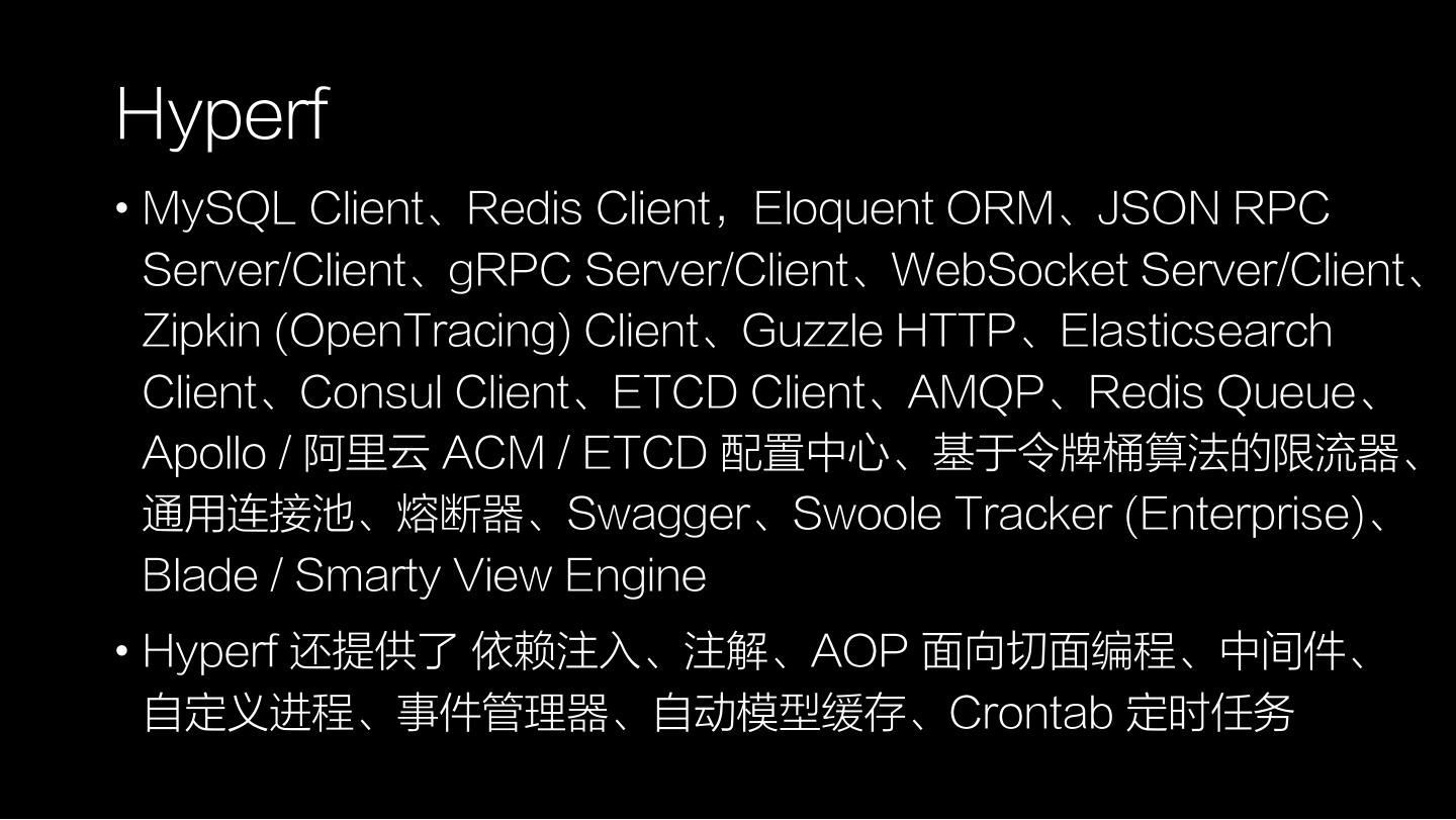 6 .Hyperf • MySQL Client、Redis Client,Eloquent ORM、JSON RPC Server/Client、gRPC Server/Client、WebSocket Server/Client、 Zipkin (OpenTracing) Client、Guzzle HTTP、Elasticsearch Client、Consul Client、ETCD Client、AMQP、Redis Queue、 Apollo / 阿里云 ACM / ETCD 配置中心、基于令牌桶算法的限流器、 通用连接池、熔断器、Swagger、Swoole Tracker (Enterprise)、 Blade / Smarty View Engine • Hyperf 还提供了 依赖注入、注解、AOP 面向切面编程、中间件、 自定义进程、事件管理器、自动模型缓存、Crontab 定时任务