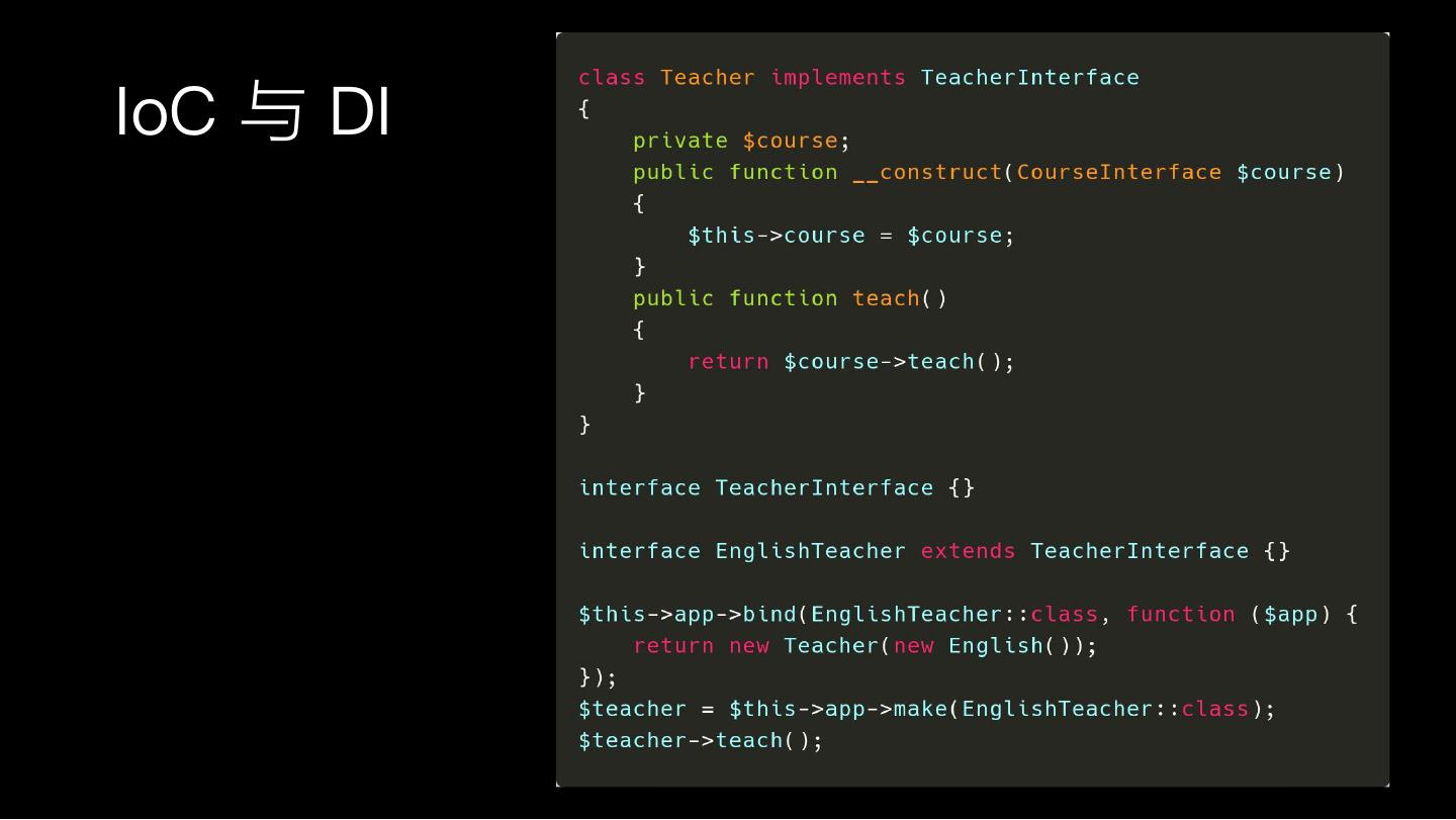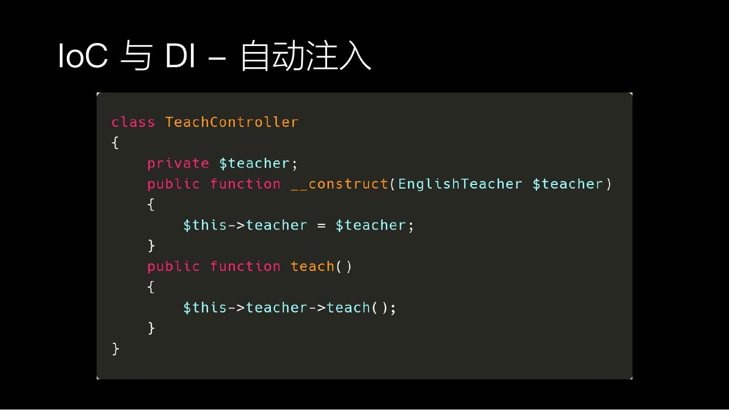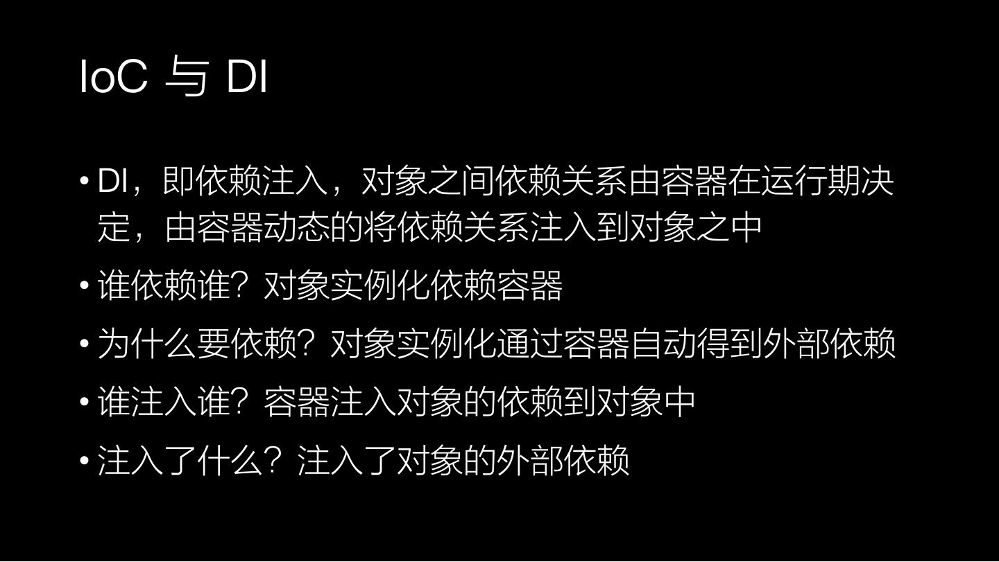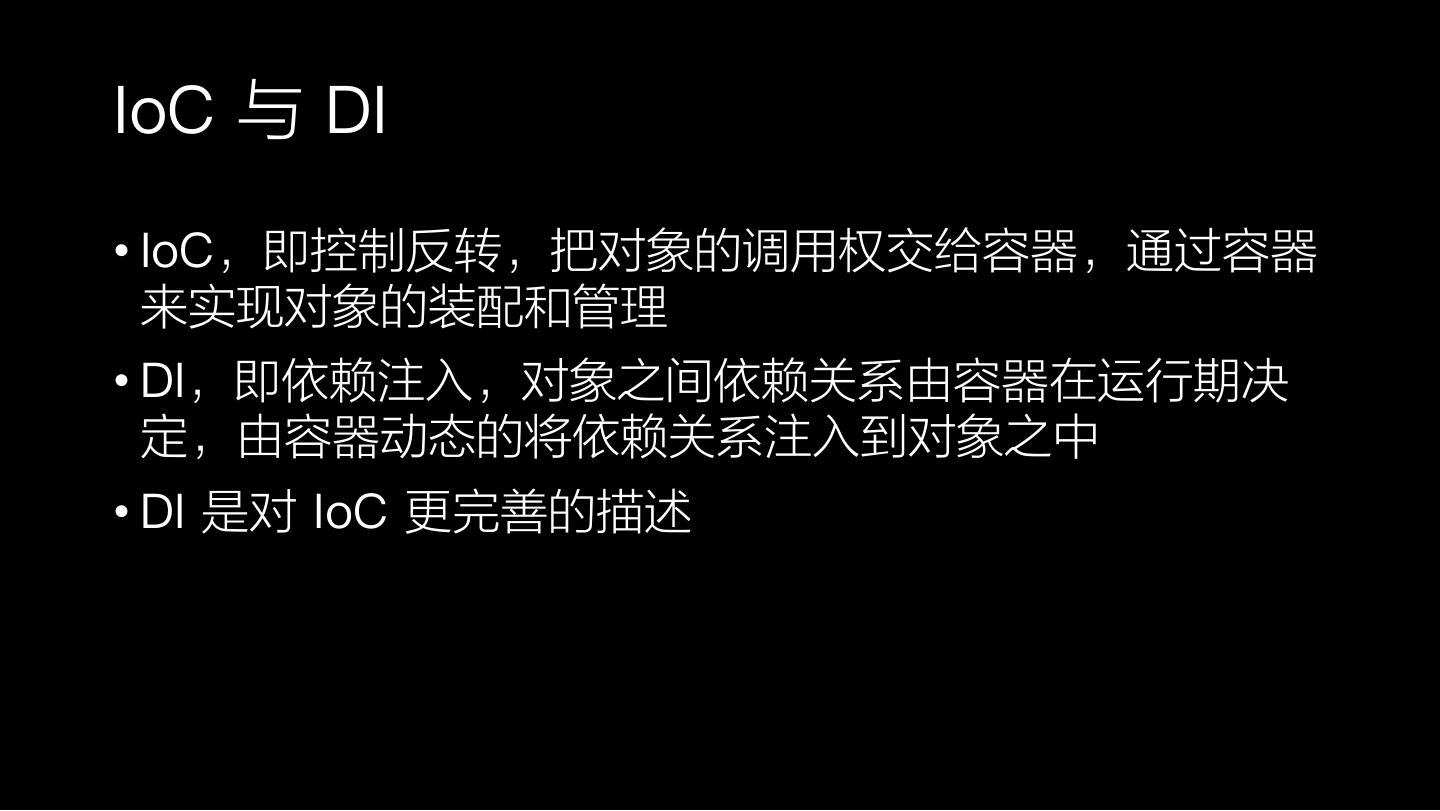 22 .IoC 与 DI • DI,即依赖注入,对象之间依赖关系由容器在运行期决 定,由容器动态的将依赖关系注入到对象之中 • 谁依赖谁?对象实例化依赖容器 • 为什么要依赖?对象实例化通过容器自动得到外部依赖 • 谁注入谁?容器注入对象的依赖到对象中 • 注入了什么?注入了对象的外部依赖