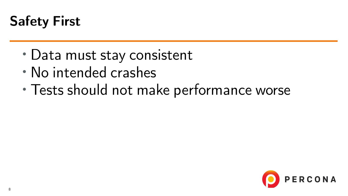 9 .Safety First • Data must stay consistent • No intended crashes • Tests should not make performance worse 8