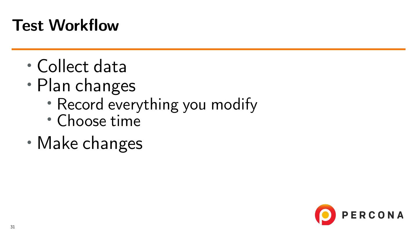 15 .General Workflow • Measure: record what is wrong • Actual and expected results • Query execution time • Overall application performance • Plan changes • Implement them • May require maintenance window 10