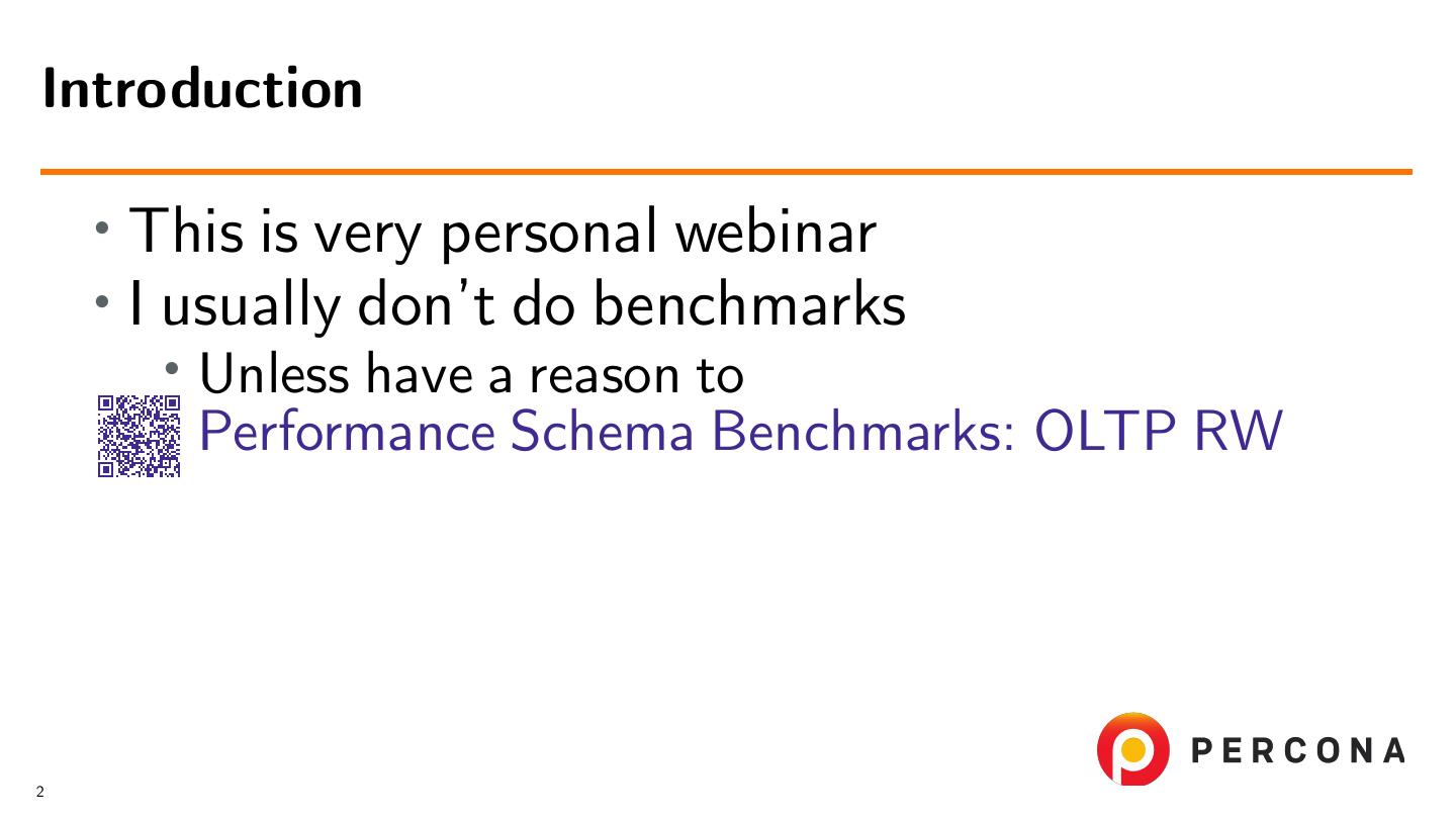3 .Introduction • This is very personal webinar • I usually don’t do benchmarks • Unless have a reason to Performance Schema Benchmarks: OLTP RW 2