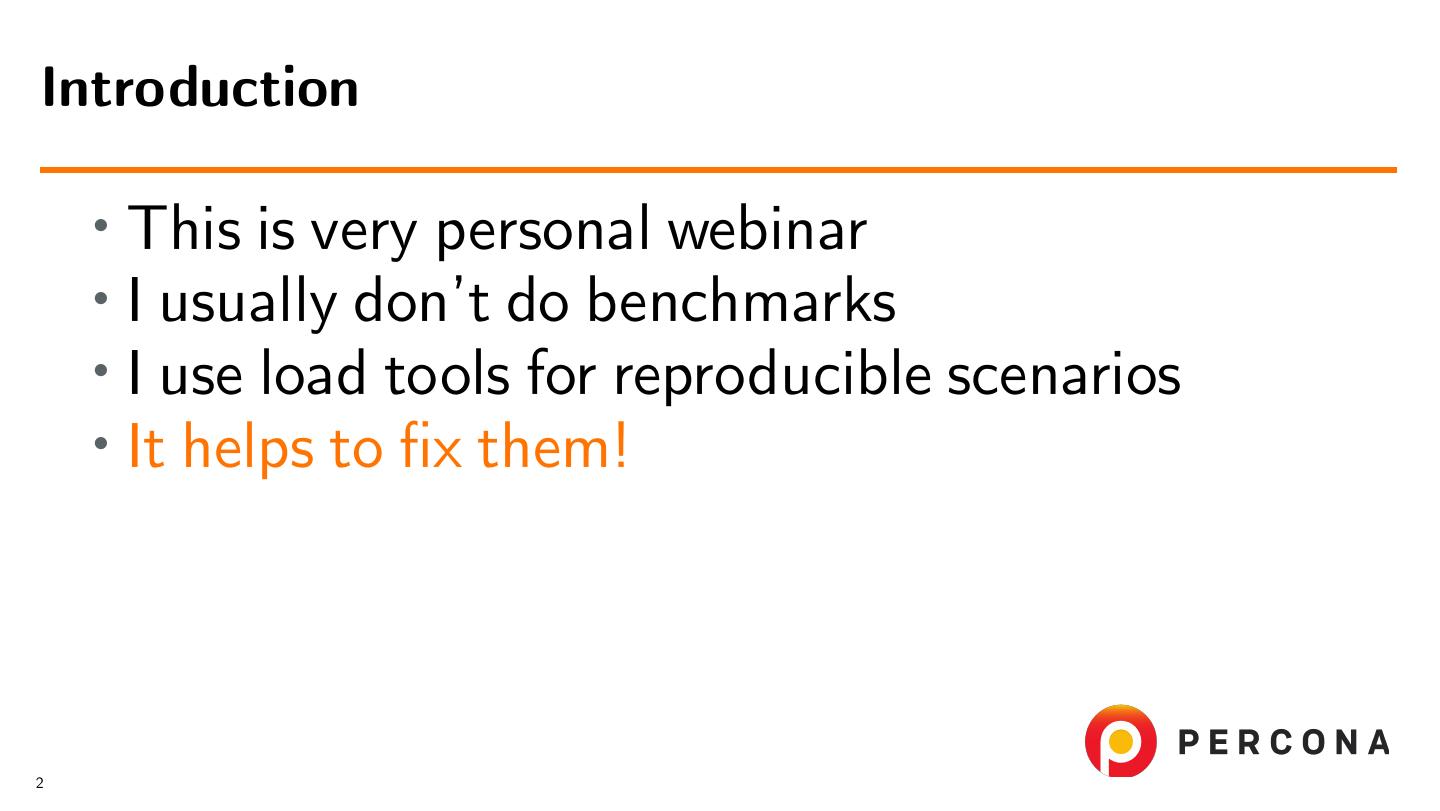 5 .Introduction • This is very personal webinar • I usually don’t do benchmarks • I use load tools for reproducible scenarios • It helps to fix them! 2