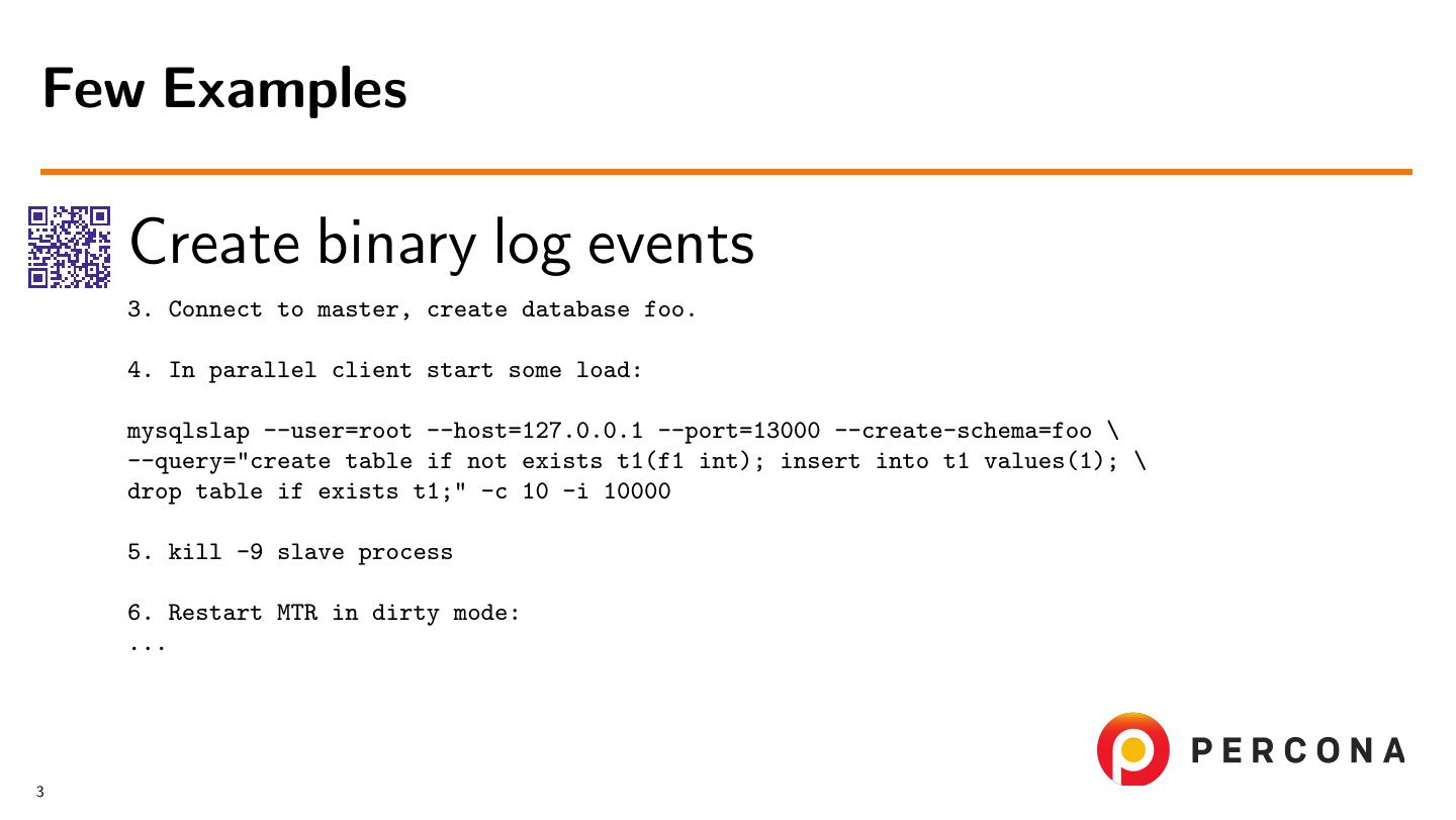 6 .Few Examples Create binary log events 3. Connect to master, create database foo. 4. In parallel client start some load: mysqlslap --user=root --host=127.0.0.1 --port=13000 --create-schema=foo \ --query="create table if not exists t1(f1 int); insert into t1 values(1); \ drop table if exists t1;" -c 10 -i 10000 5. kill -9 slave process 6. Restart MTR in dirty mode: ... 3