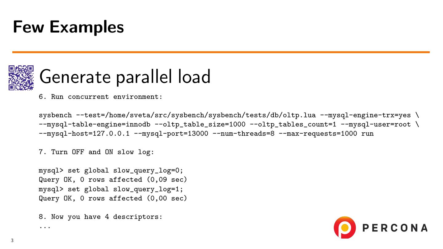 7 .Few Examples Generate parallel load 6. Run concurrent environment: sysbench --test=/home/sveta/src/sysbench/sysbench/tests/db/oltp.lua --mysql-engine-trx=yes \ --mysql-table-engine=innodb --oltp_table_size=1000 --oltp_tables_count=1 --mysql-user=root \ --mysql-host=127.0.0.1 --mysql-port=13000 --num-threads=8 --max-requests=1000 run 7. Turn OFF and ON slow log: mysql> set global slow_query_log=0; Query OK, 0 rows affected (0,09 sec) mysql> set global slow_query_log=1; Query OK, 0 rows affected (0,00 sec) 8. Now you have 4 descriptors: ... 3