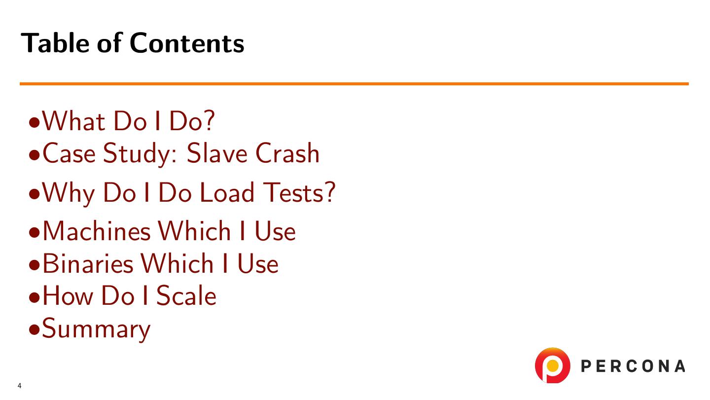 9 .Table of Contents •What Do I Do? •Case Study: Slave Crash •Why Do I Do Load Tests? •Machines Which I Use •Binaries Which I Use •How Do I Scale •Summary 4