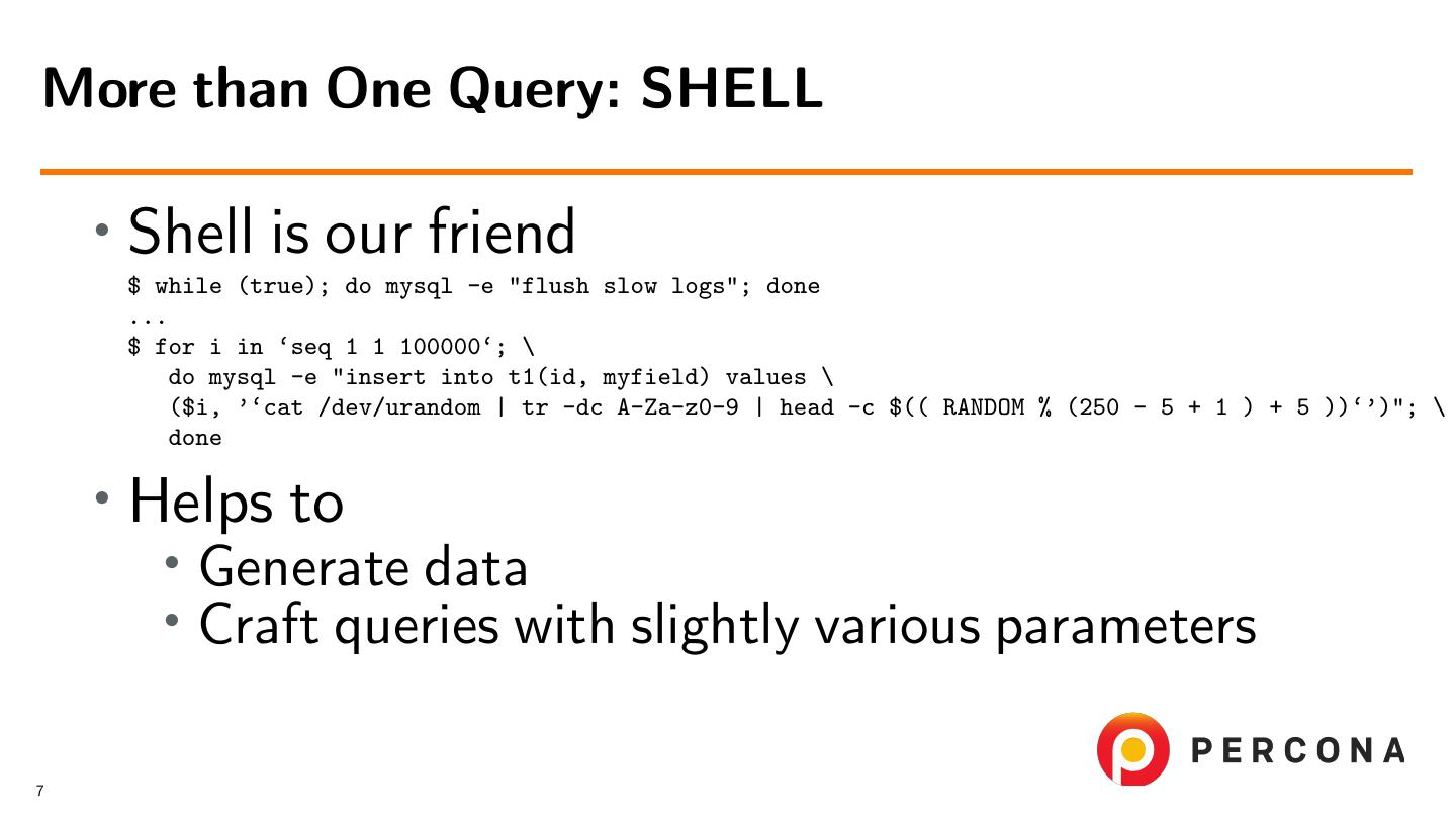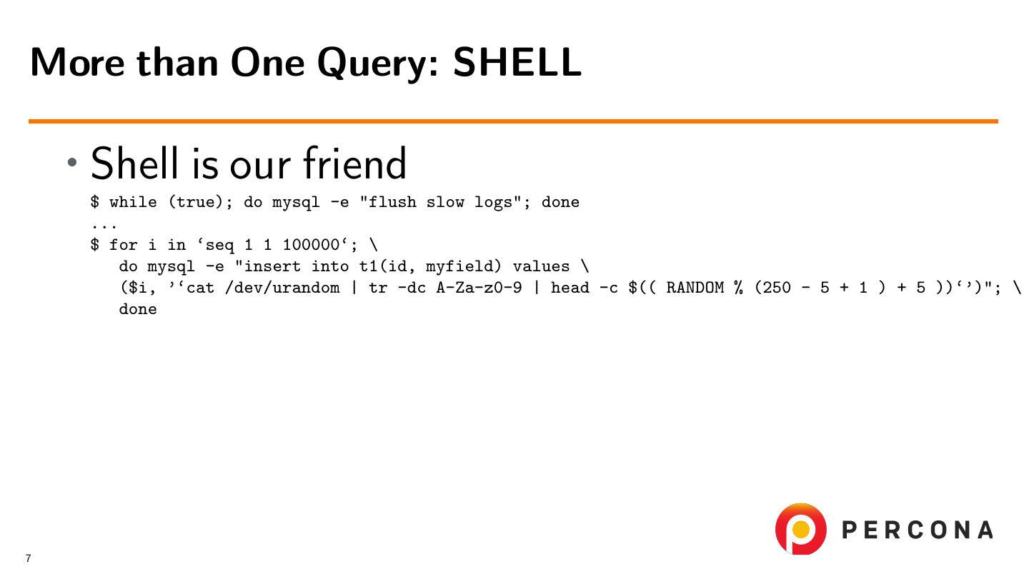 15 .More than One Query: SHELL • Shell is our friend $ while (true); do mysql -e "flush slow logs"; done ... $ for i in ‘seq 1 1 100000‘; \ do mysql -e "insert into t1(id, myfield) values \ ($i, ’‘cat /dev/urandom | tr -dc A-Za-z0-9 | head -c $(( RANDOM % (250 - 5 + 1 ) + 5 ))‘’)"; \ done • Helps to • Generate data • Craft queries with slightly various parameters • Execute in multiple terminals 7 • To imitate concurrent load