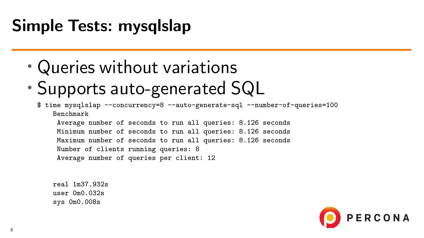 17 .Simple Tests: mysqlslap • Queries without variations • Supports auto-generated SQL $ time mysqlslap --concurrency=8 --auto-generate-sql --number-of-queries=100 Benchmark Average number of seconds to run all queries: 8.126 seconds Minimum number of seconds to run all queries: 8.126 seconds Maximum number of seconds to run all queries: 8.126 seconds Number of clients running queries: 8 Average number of queries per client: 12 real 1m37.932s user 0m0.032s sys 0m0.008s 8