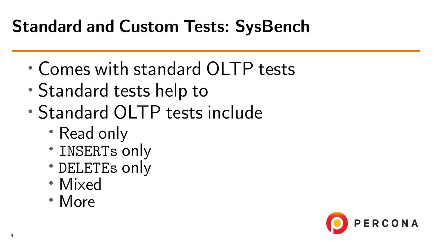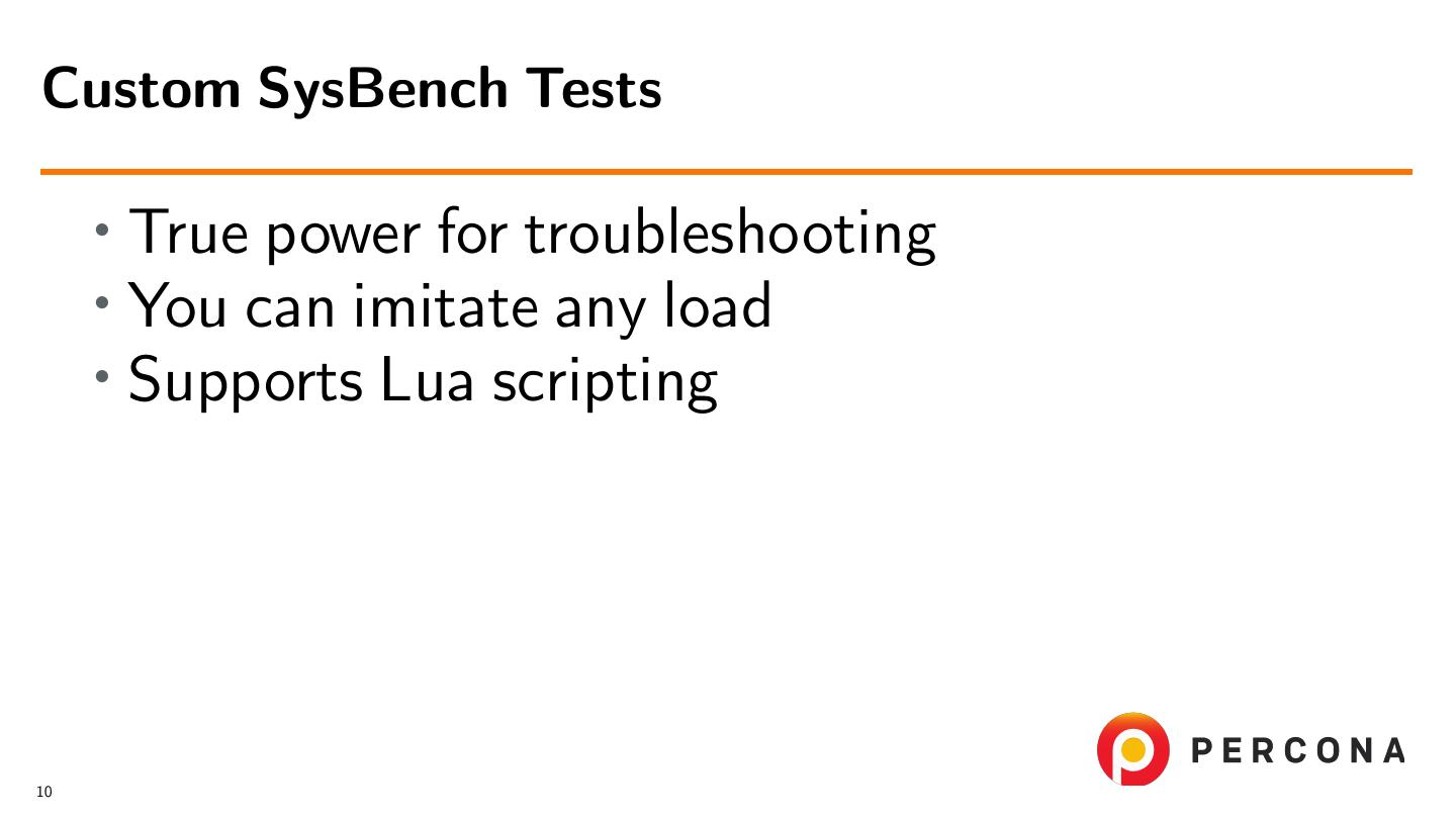 25 .Standard and Custom Tests: SysBench • Comes with standard OLTP tests • Standard tests help to • Standard OLTP tests include • SysBench has standard hardware tests • I use mostly OLTP for troubleshooting 9