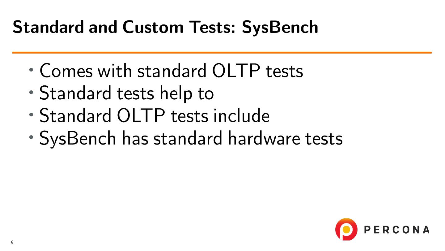 24 .Standard and Custom Tests: SysBench • Comes with standard OLTP tests • Standard tests help to • Standard OLTP tests include • SysBench has standard hardware tests 9