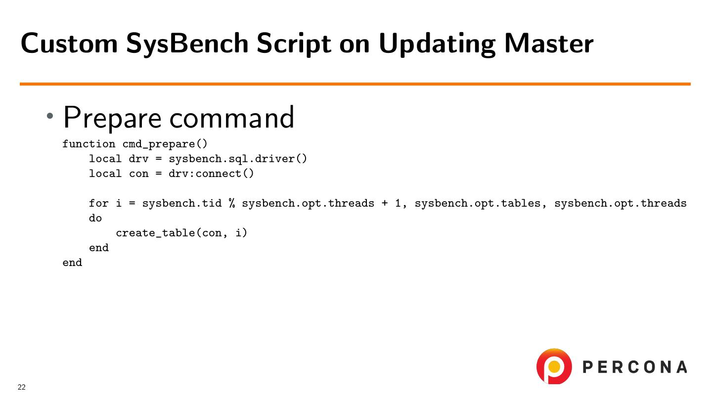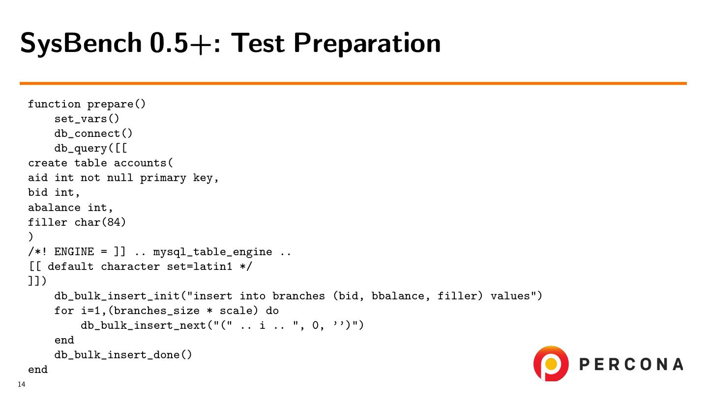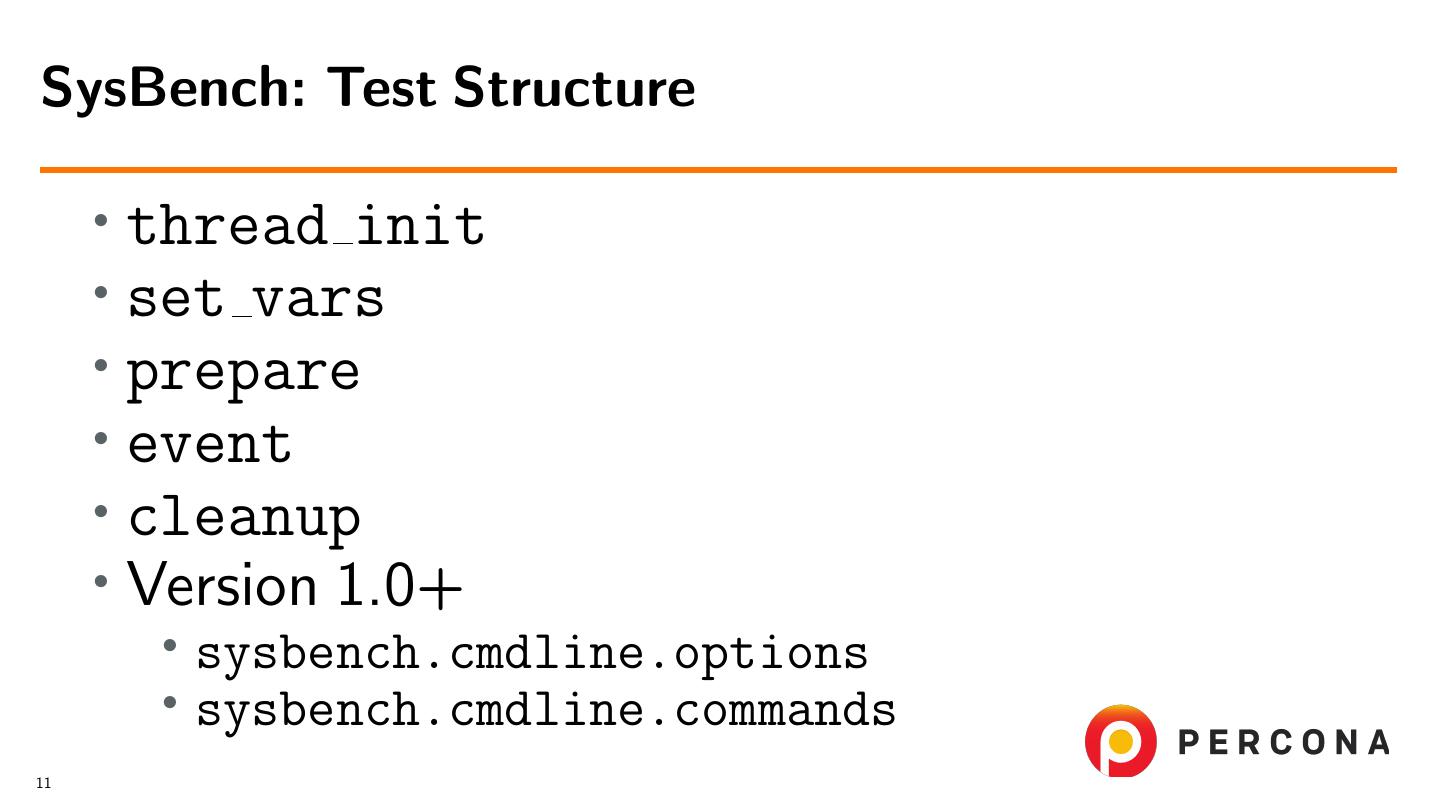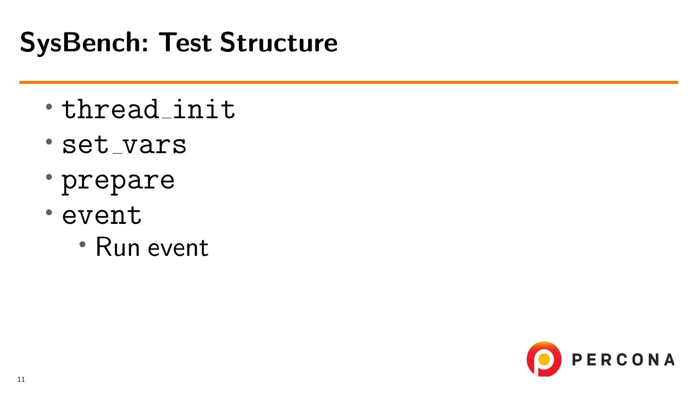 29 .SysBench: Test Structure • thread init • set vars • prepare • Prepare test 11