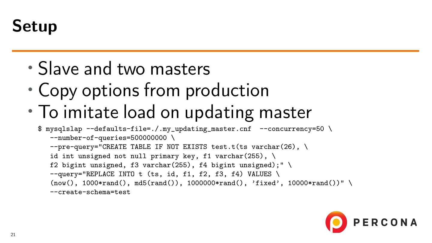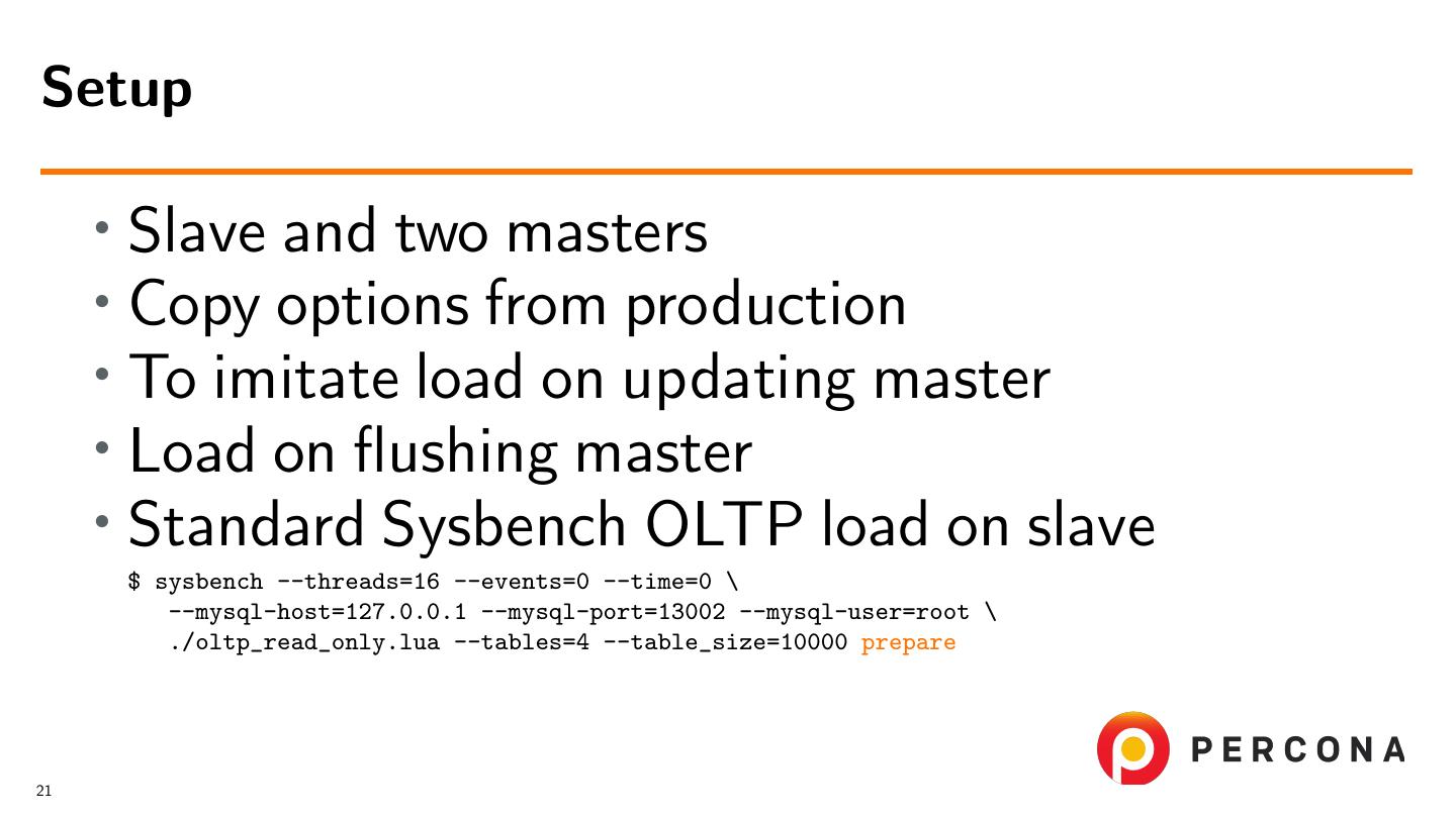 20 .Standard and Custom Tests: SysBench • Comes with standard OLTP tests $ sysbench --test=/home/sveta/src/sysbench/sysbench/tests/db/oltp.lua \ --mysql-engine-trx=yes --mysql-table-engine=innodb --oltp_table_size=10000 \ --oltp_tables_count=2 --num-threads=8 \ --mysql-user=root --mysql-host=127.0.0.1 --mysql-port=13002 prepare sysbench 0.5: multi-threaded system evaluation benchmark Creating table ’sbtest1’... Inserting 10000 records into ’sbtest1’ Creating secondary indexes on ’sbtest1’... Creating table ’sbtest2’... Inserting 10000 records into ’sbtest2’ Creating secondary indexes on ’sbtest2’... 9