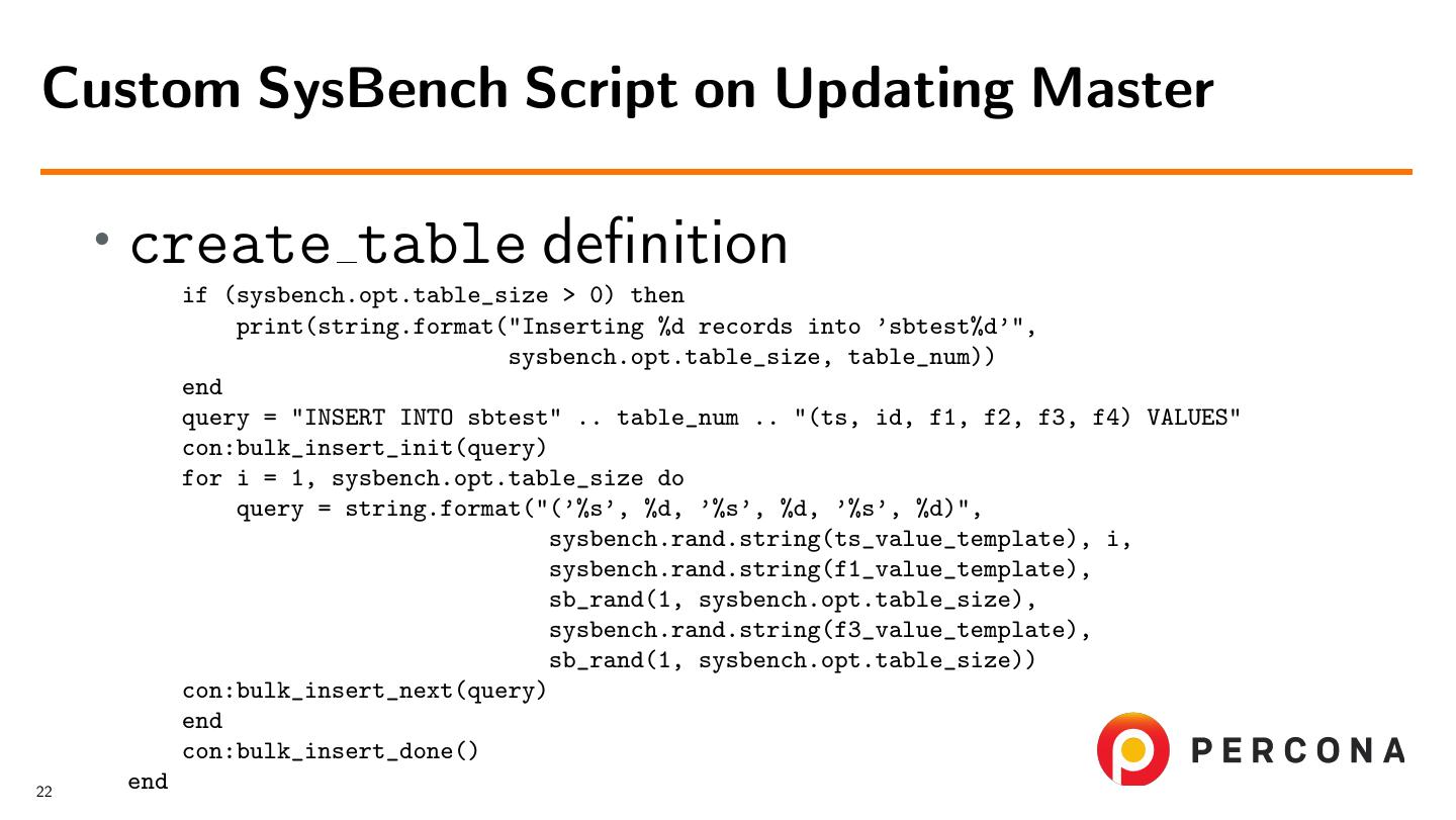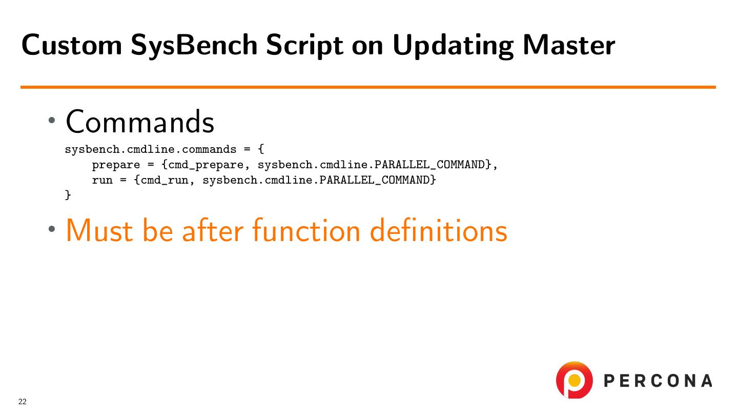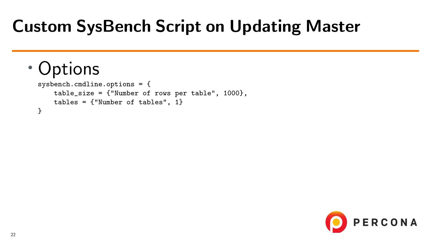 22 .Standard and Custom Tests: SysBench • Comes with standard OLTP tests • Standard tests help to • Imitate some activity • Generate binary log events • Test effect of options/upgrades 9