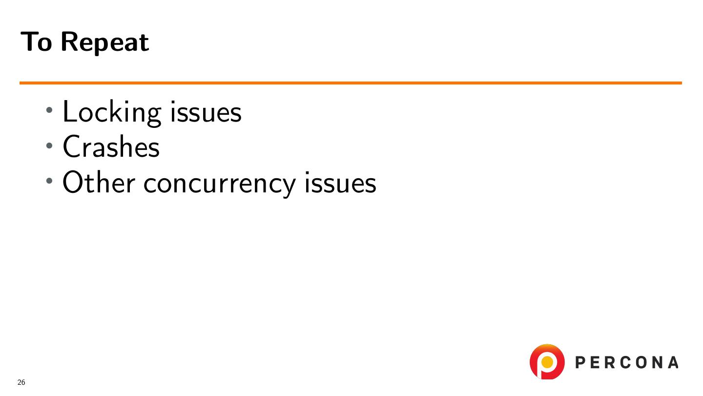 但是,在进行故障排除时,我确实经常使用基准测试工具。这个网络研讨会不包括实际的基准测试,但它关注的是基准测试工具。当您需要重复并发客户机执行导致的情况时,它们是最佳选择。这些类型的问题包括各种锁定和性能问题,以及暂停和崩溃。