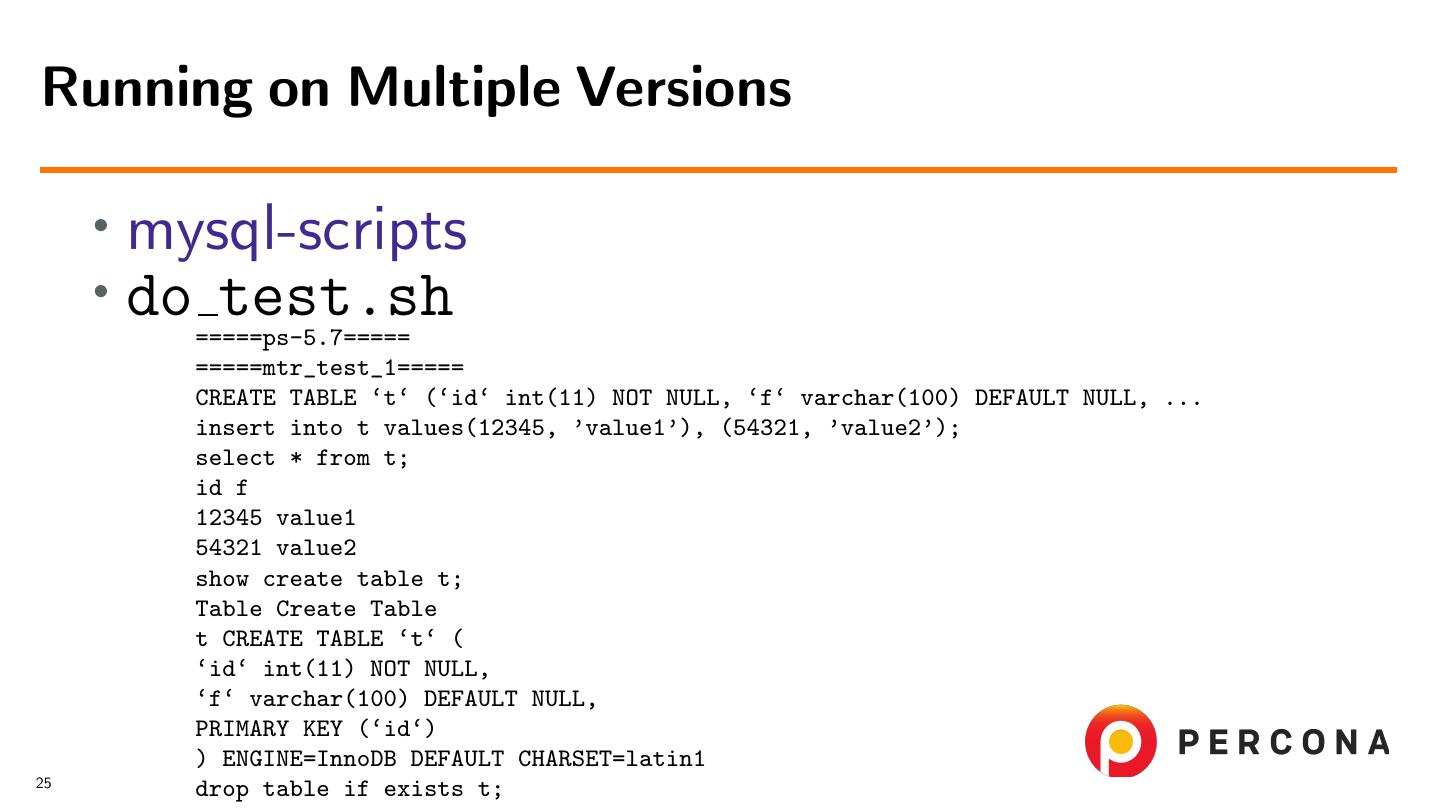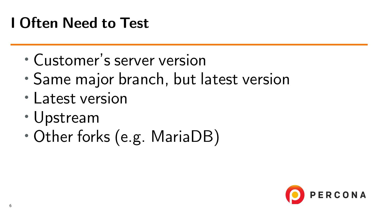 15 .I Often Need to Test • Customer’s server version • Same major branch, but latest version • Latest version • Upstream • Other forks (e.g. MariaDB) • Same scenario 6