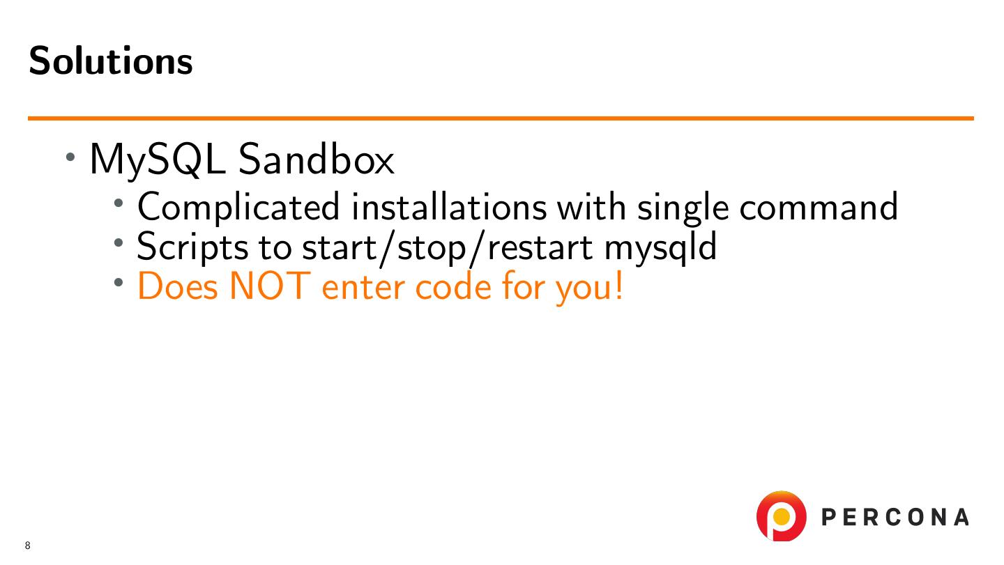 17 .Solutions • MySQL Sandbox • Complicated installations with single command • Scripts to start/stop/restart mysqld • Does NOT enter code for you! 8