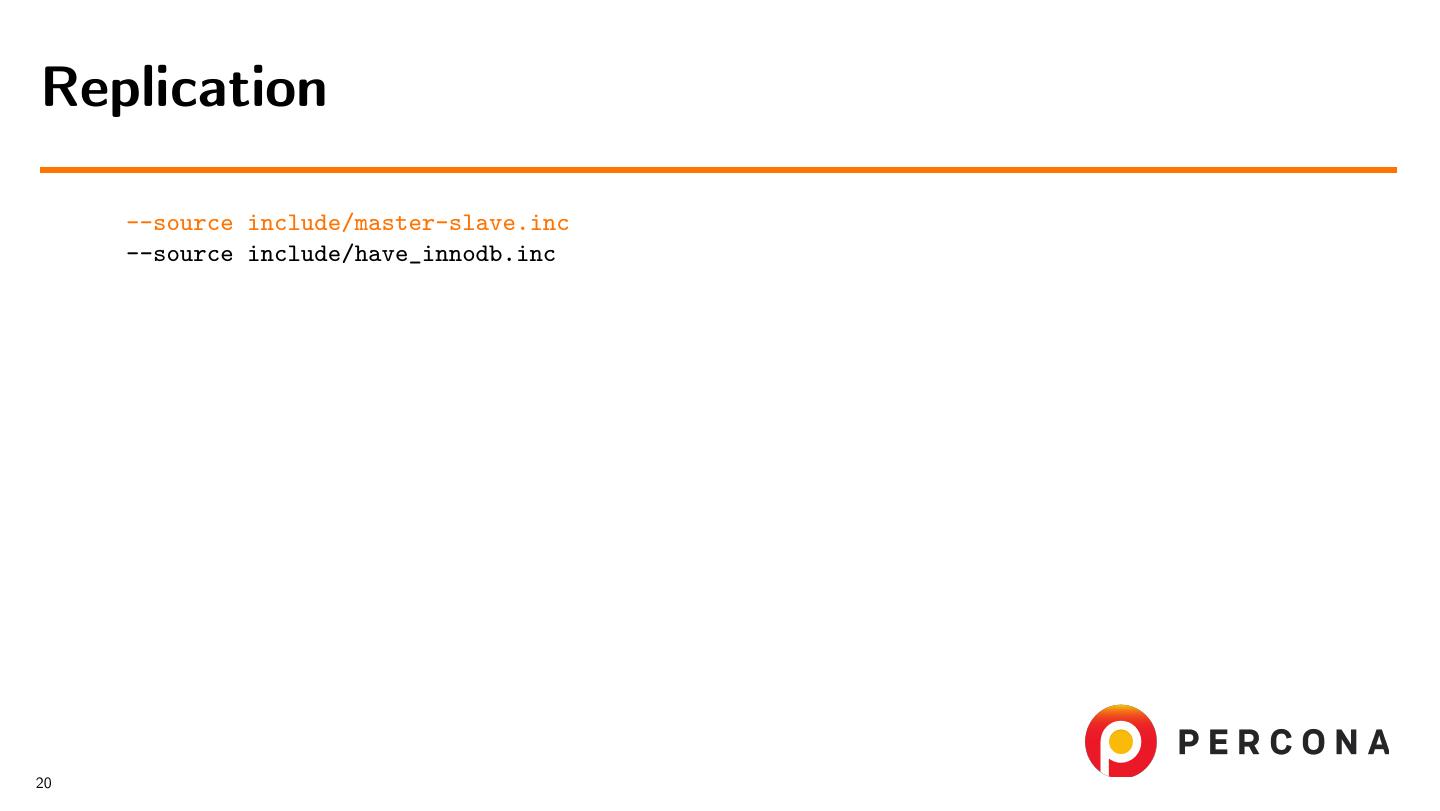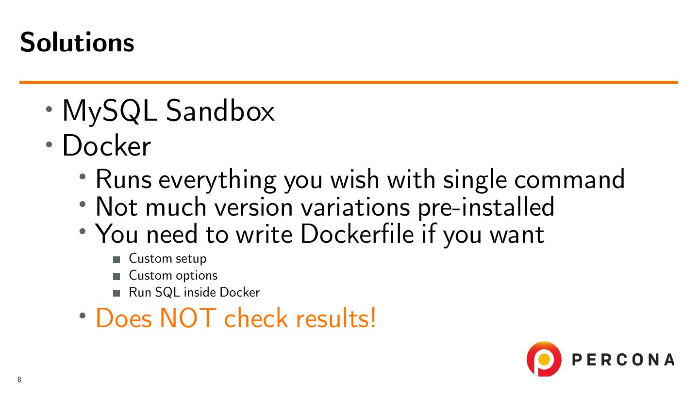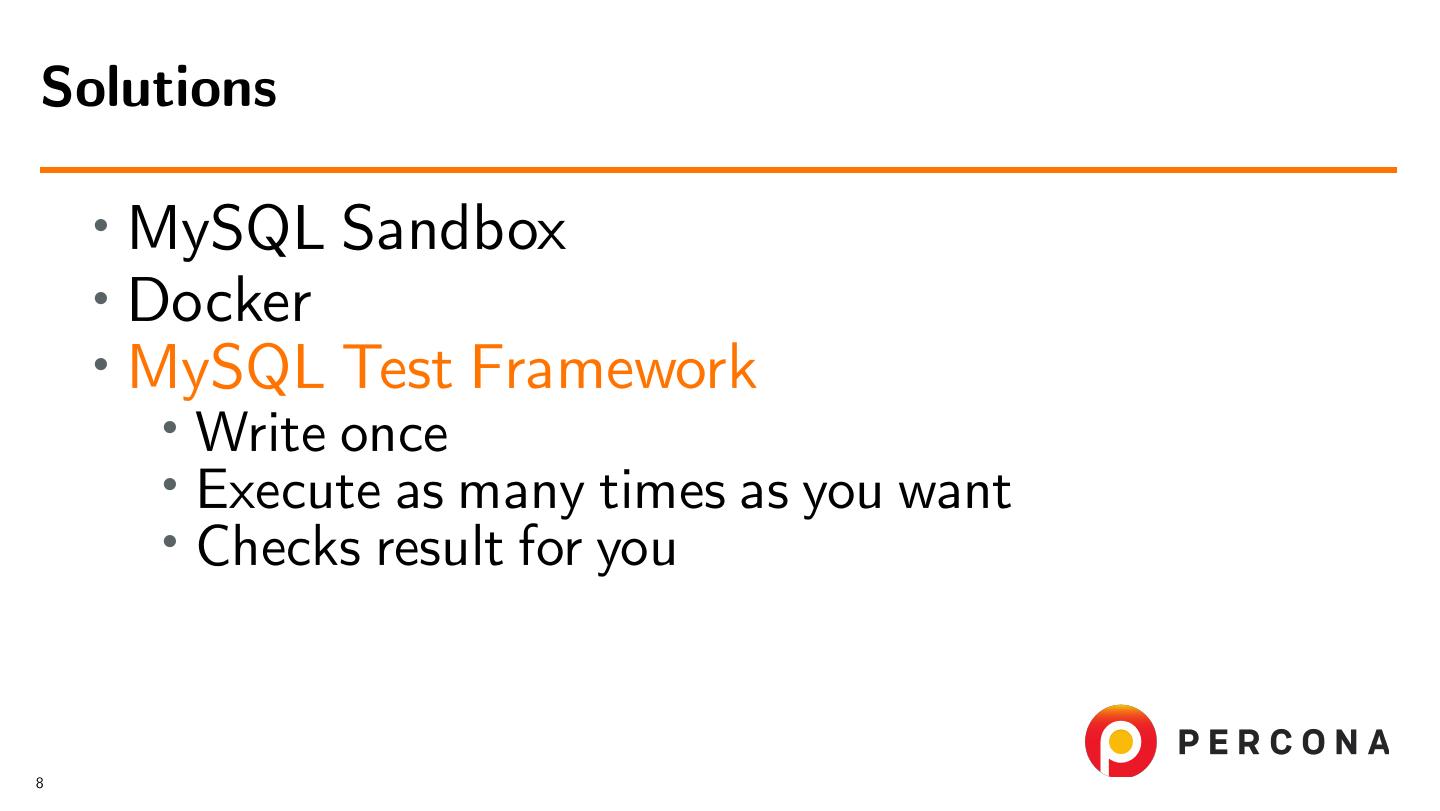 19 .Solutions • MySQL Sandbox • Docker • MySQL Test Framework • Write once • Execute as many times as you want • Checks result for you 8