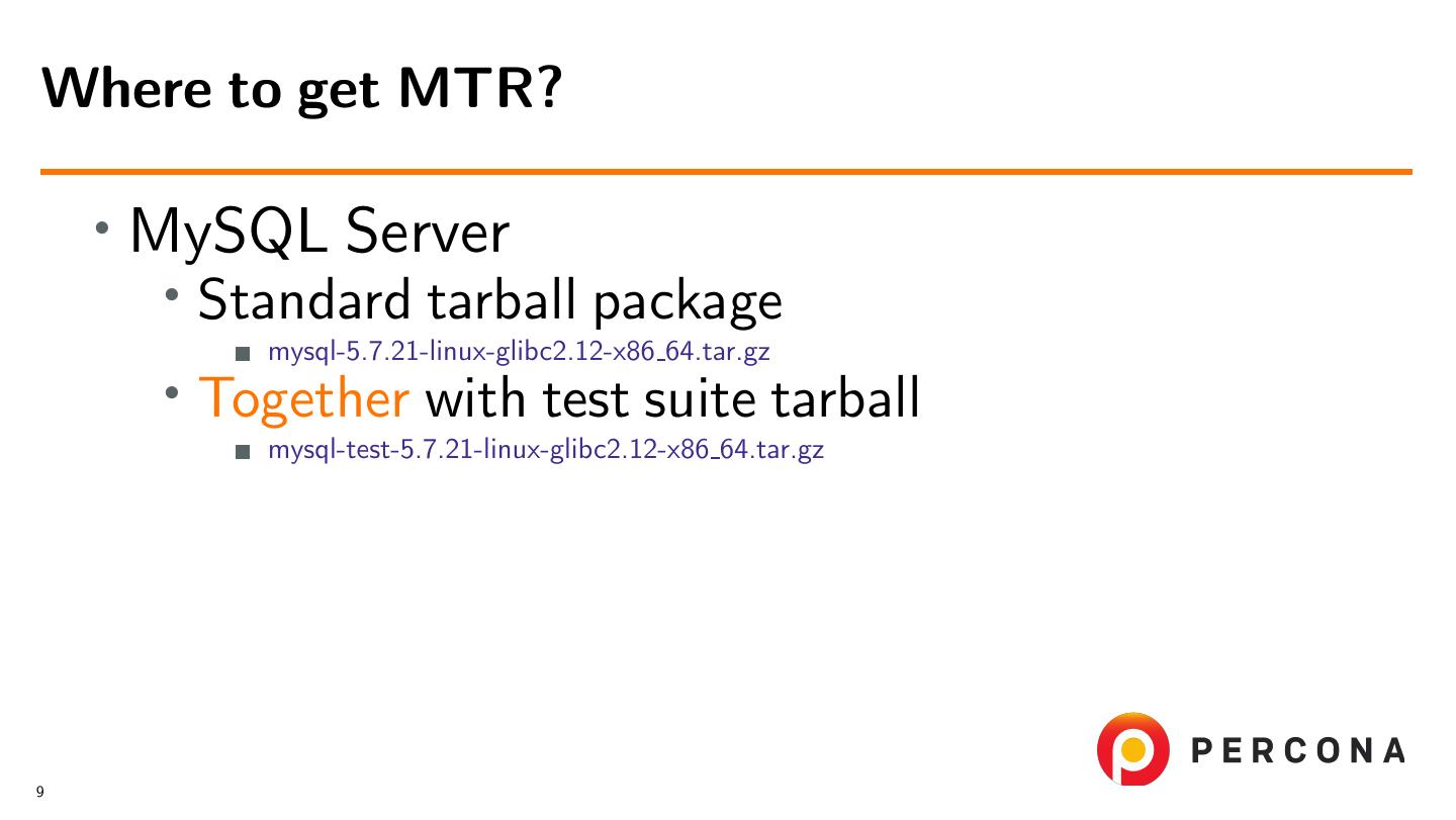 20 .Where to get MTR? • MySQL Server • Standard tarball package mysql-5.7.21-linux-glibc2.12-x86 64.tar.gz • Together with test suite tarball mysql-test-5.7.21-linux-glibc2.12-x86 64.tar.gz 9