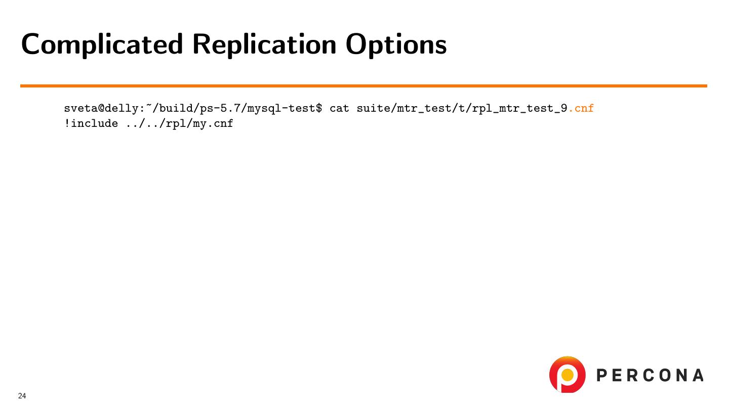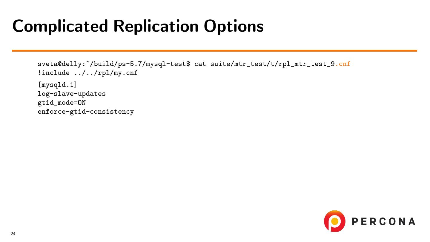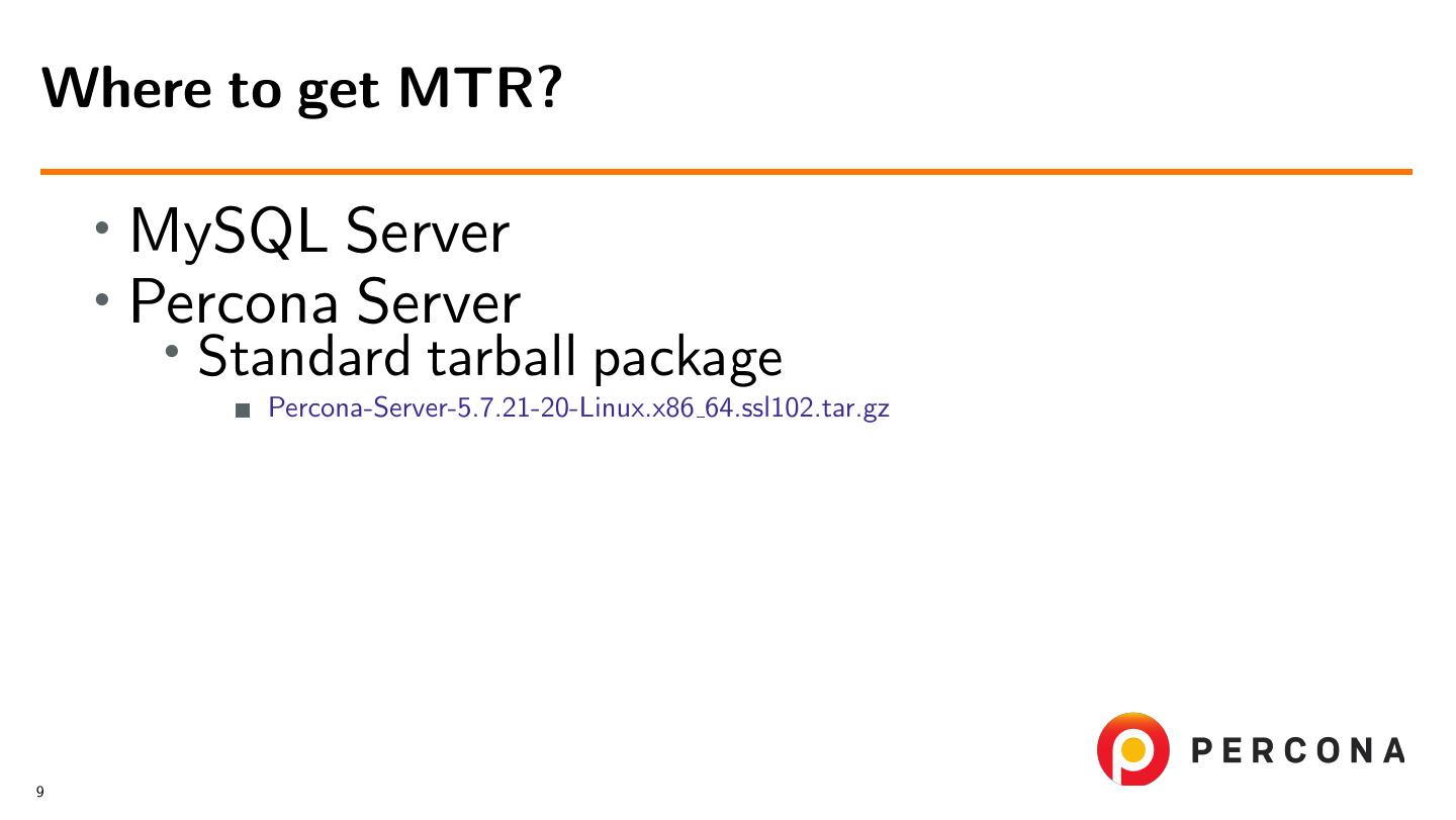 23 .Where to get MTR? • MySQL Server • Percona Server • Standard tarball package Percona-Server-5.7.21-20-Linux.x86 64.ssl102.tar.gz • Test suite package for your OS percona-server-test-5.7 5.7.21-20-1.artful amd64.deb 9