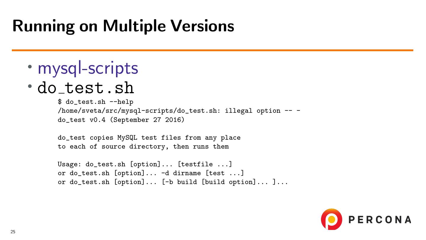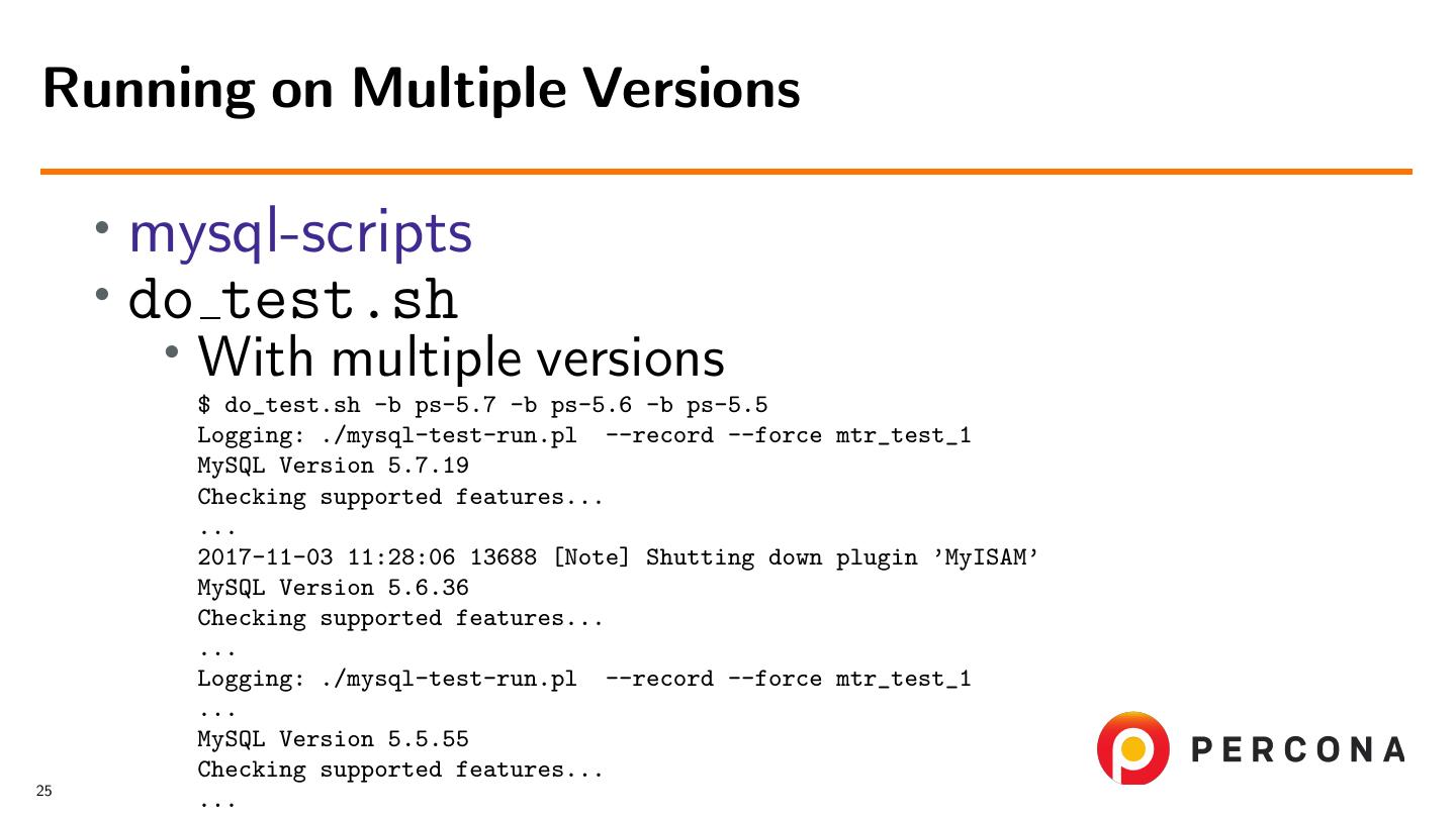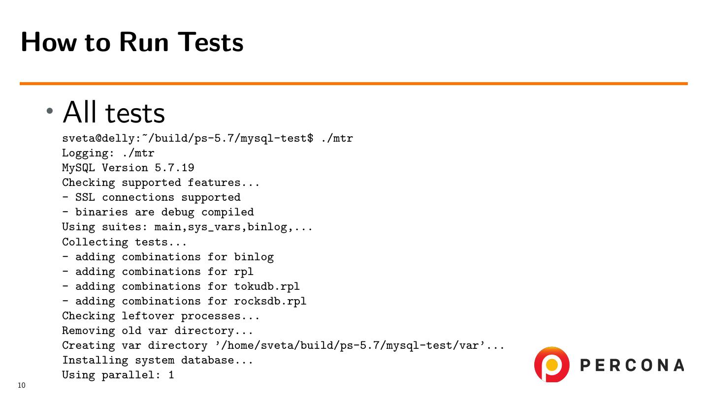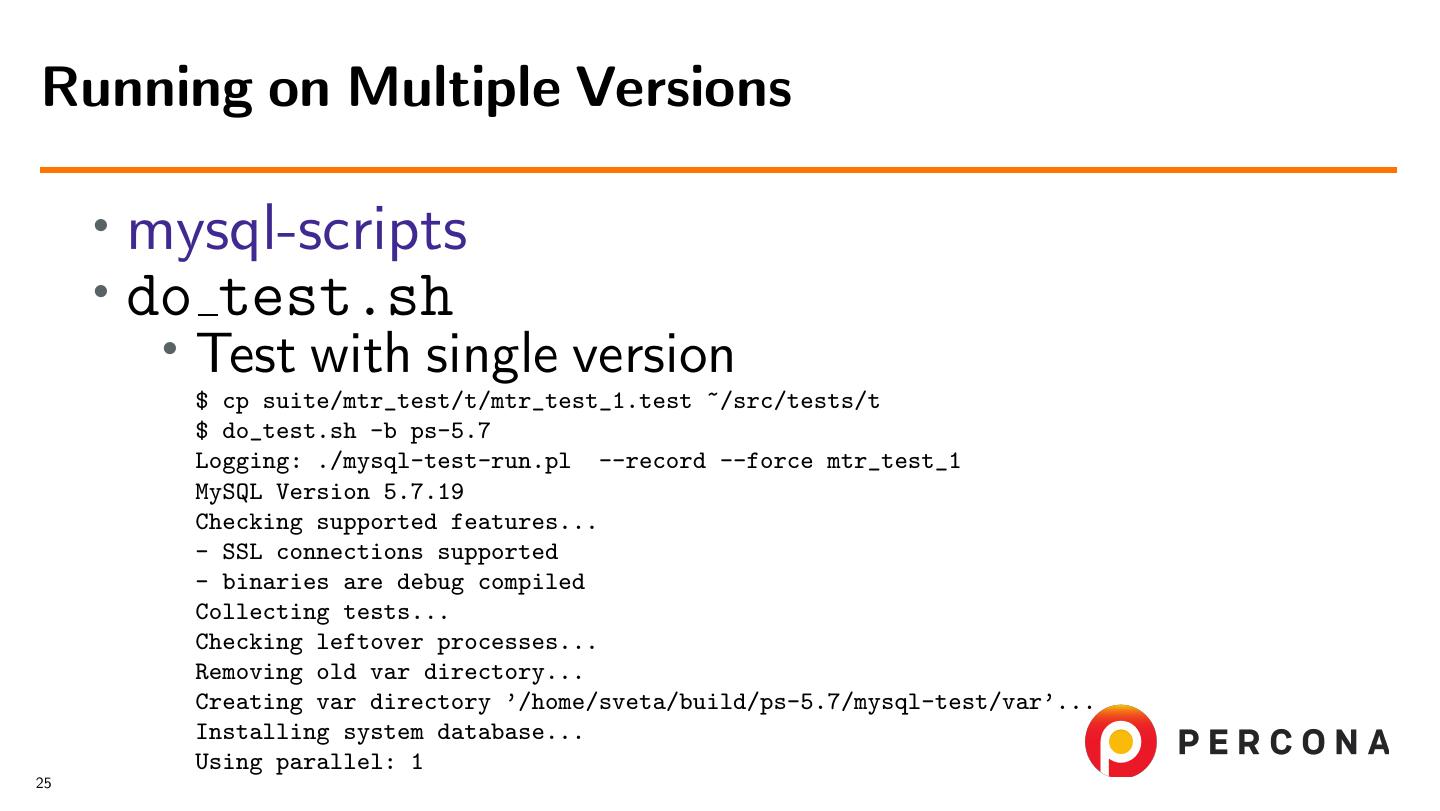 24 .How to Run Tests • All tests sveta@delly:~/build/ps-5.7/mysql-test$ ./mtr Logging: ./mtr MySQL Version 5.7.19 Checking supported features... - SSL connections supported - binaries are debug compiled Using suites: main,sys_vars,binlog,... Collecting tests... - adding combinations for binlog - adding combinations for rpl - adding combinations for tokudb.rpl - adding combinations for rocksdb.rpl Checking leftover processes... Removing old var directory... Creating var directory ’/home/sveta/build/ps-5.7/mysql-test/var’... Installing system database... Using parallel: 1 10