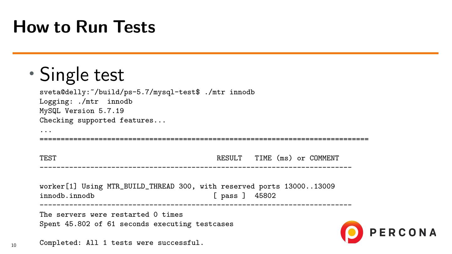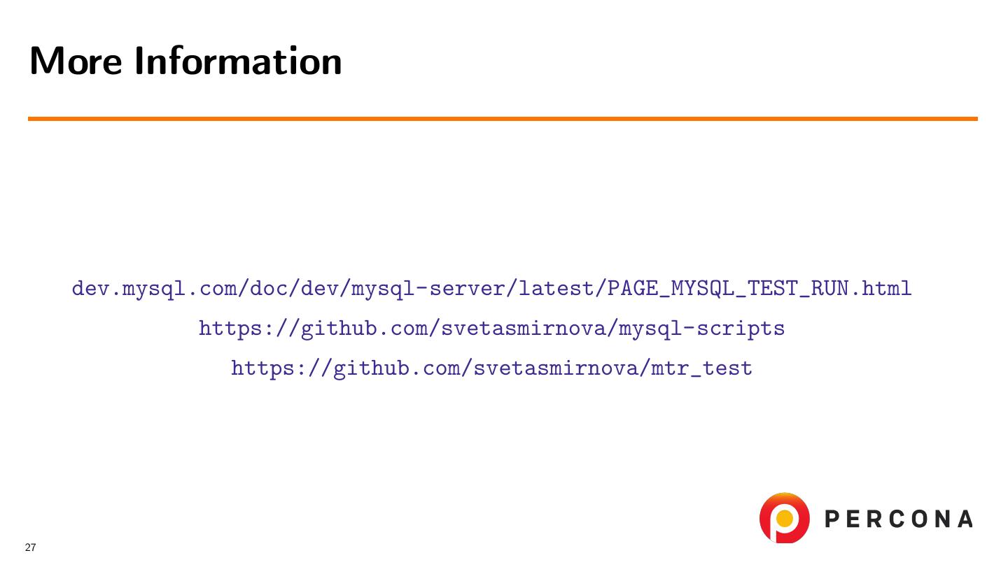 26 .How to Run Tests • Single test sveta@delly:~/build/ps-5.7/mysql-test$ ./mtr innodb Logging: ./mtr innodb MySQL Version 5.7.19 Checking supported features... ... ============================================================================== TEST RESULT TIME (ms) or COMMENT -------------------------------------------------------------------------- worker[1] Using MTR_BUILD_THREAD 300, with reserved ports 13000..13009 innodb.innodb [ pass ] 45802 -------------------------------------------------------------------------- The servers were restarted 0 times Spent 45.802 of 61 seconds executing testcases 10 Completed: All 1 tests were successful.
