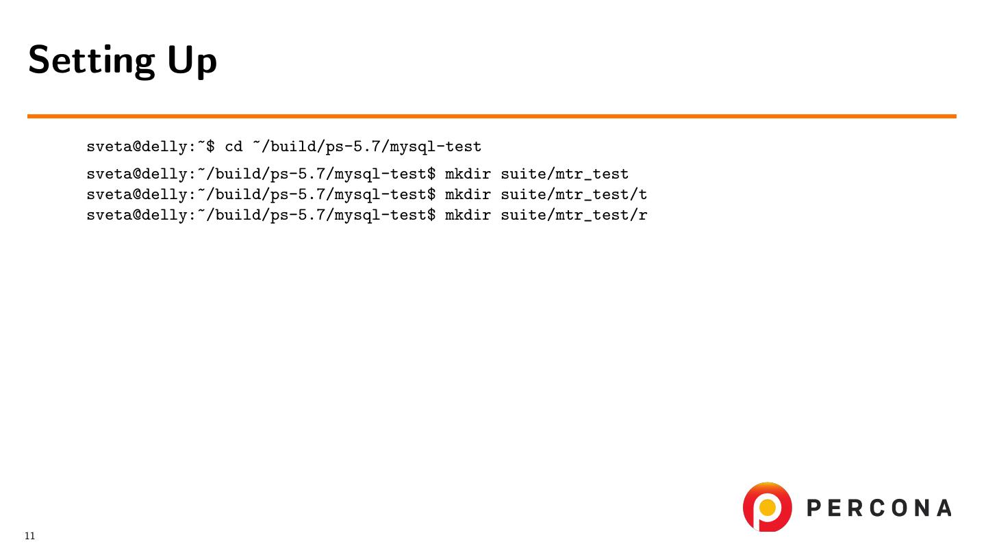 29 .Setting Up sveta@delly:~$ cd ~/build/ps-5.7/mysql-test sveta@delly:~/build/ps-5.7/mysql-test$ mkdir suite/mtr_test sveta@delly:~/build/ps-5.7/mysql-test$ mkdir suite/mtr_test/t sveta@delly:~/build/ps-5.7/mysql-test$ mkdir suite/mtr_test/r 11
