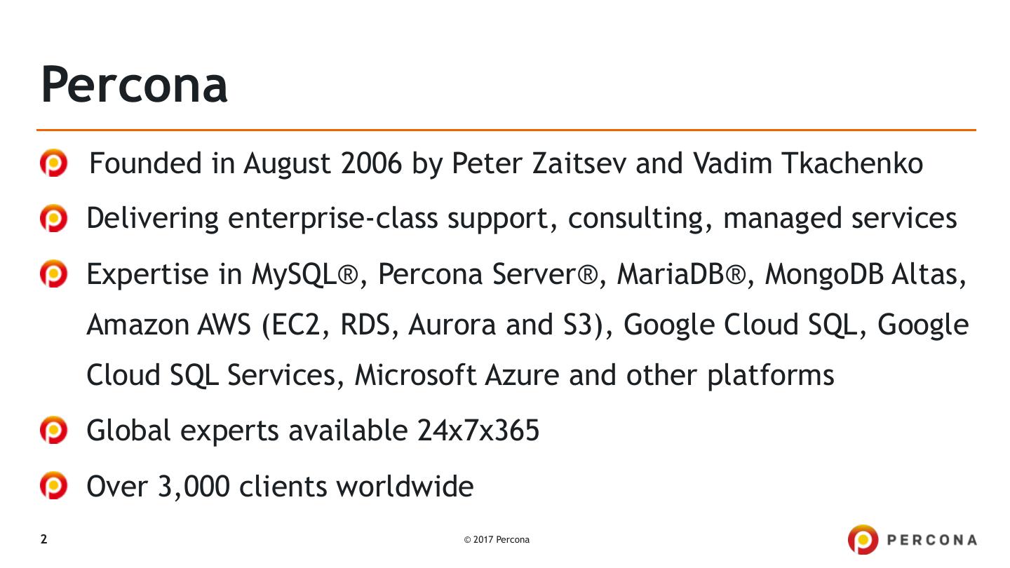 2 .Percona Founded in August 2006 by Peter Zaitsev and Vadim Tkachenko Delivering enterprise-class support, consulting, managed services Expertise in MySQL®, Percona Server®, MariaDB®, MongoDB Altas, Amazon AWS (EC2, RDS, Aurora and S3), Google Cloud SQL, Google Cloud SQL Services, Microsoft Azure and other platforms Global experts available 24x7x365 Over 3,000 clients worldwide 2 © 2017 Percona