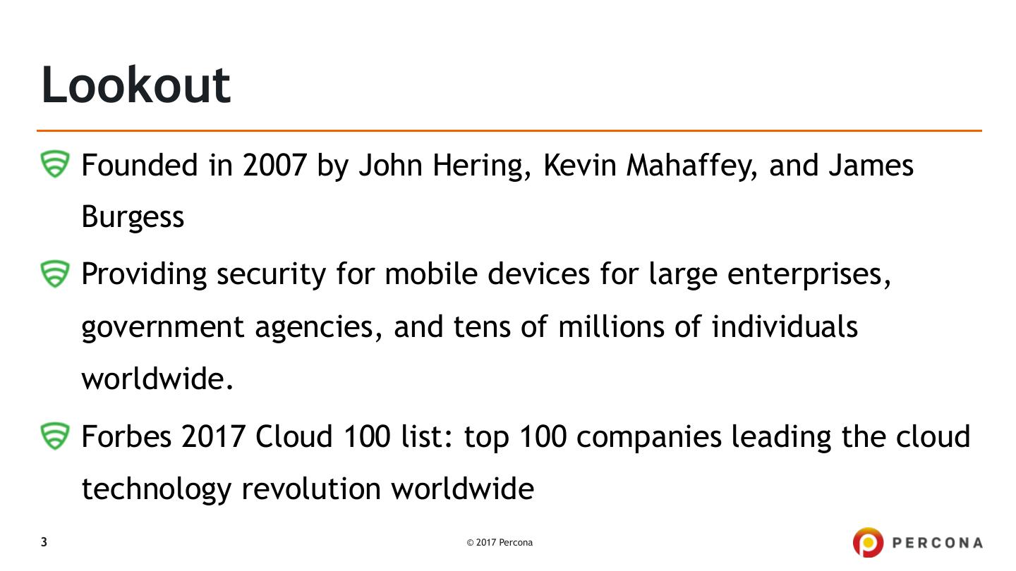 3 .Lookout Founded in 2007 by John Hering, Kevin Mahaffey, and James Burgess Providing security for mobile devices for large enterprises, government agencies, and tens of millions of individuals worldwide. Forbes 2017 Cloud 100 list: top 100 companies leading the cloud technology revolution worldwide 3 © 2017 Percona