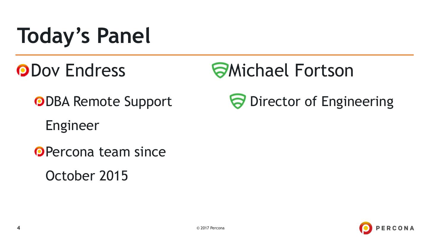 4 .Today’s Panel Dov Endress Michael Fortson DBA Remote Support Director of Engineering Engineer Percona team since October 2015 4 © 2017 Percona