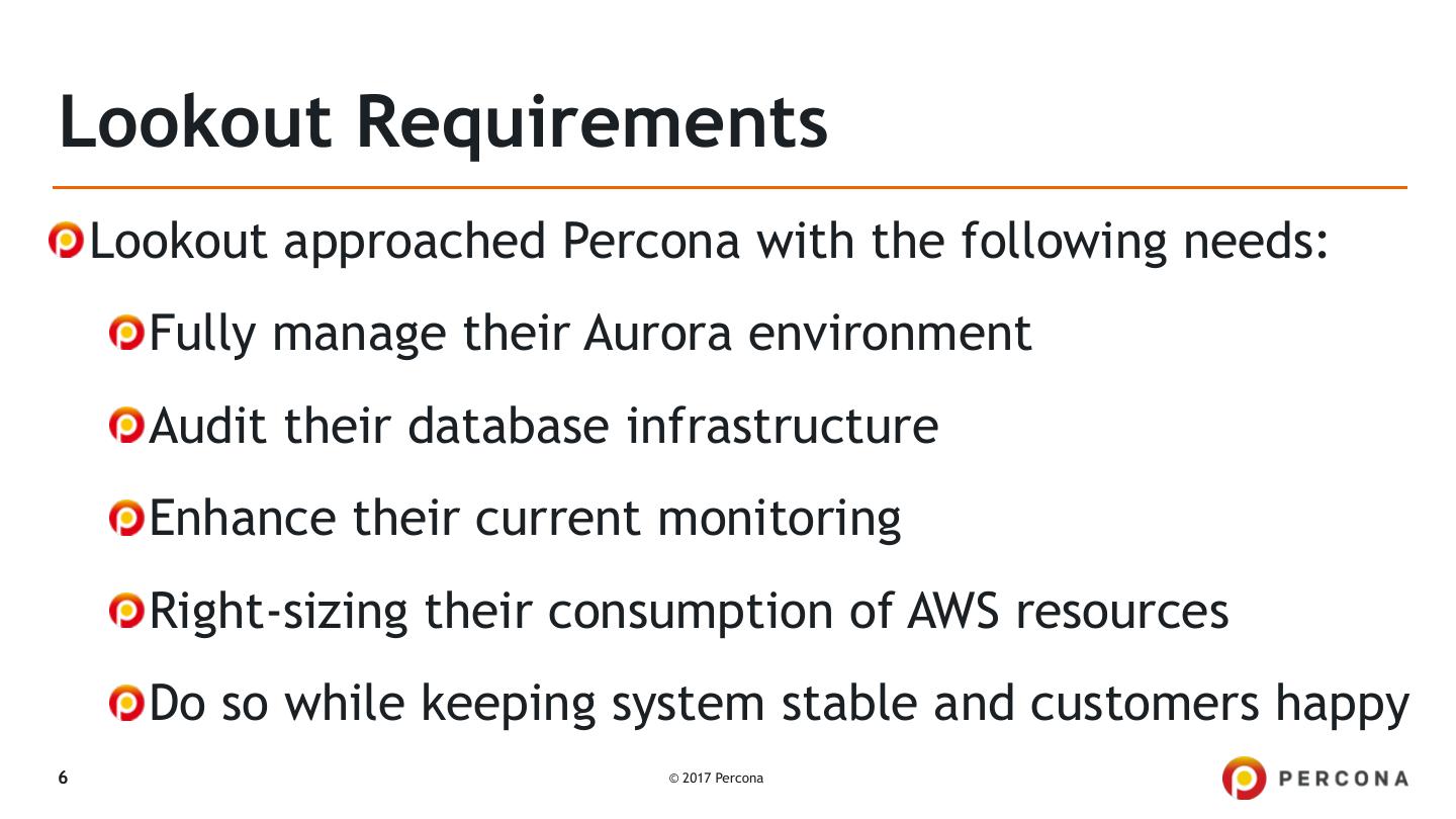 6 .Lookout Requirements Lookout approached Percona with the following needs: Fully manage their Aurora environment Audit their database infrastructure Enhance their current monitoring Right-sizing their consumption of AWS resources Do so while keeping system stable and customers happy 6 © 2017 Percona