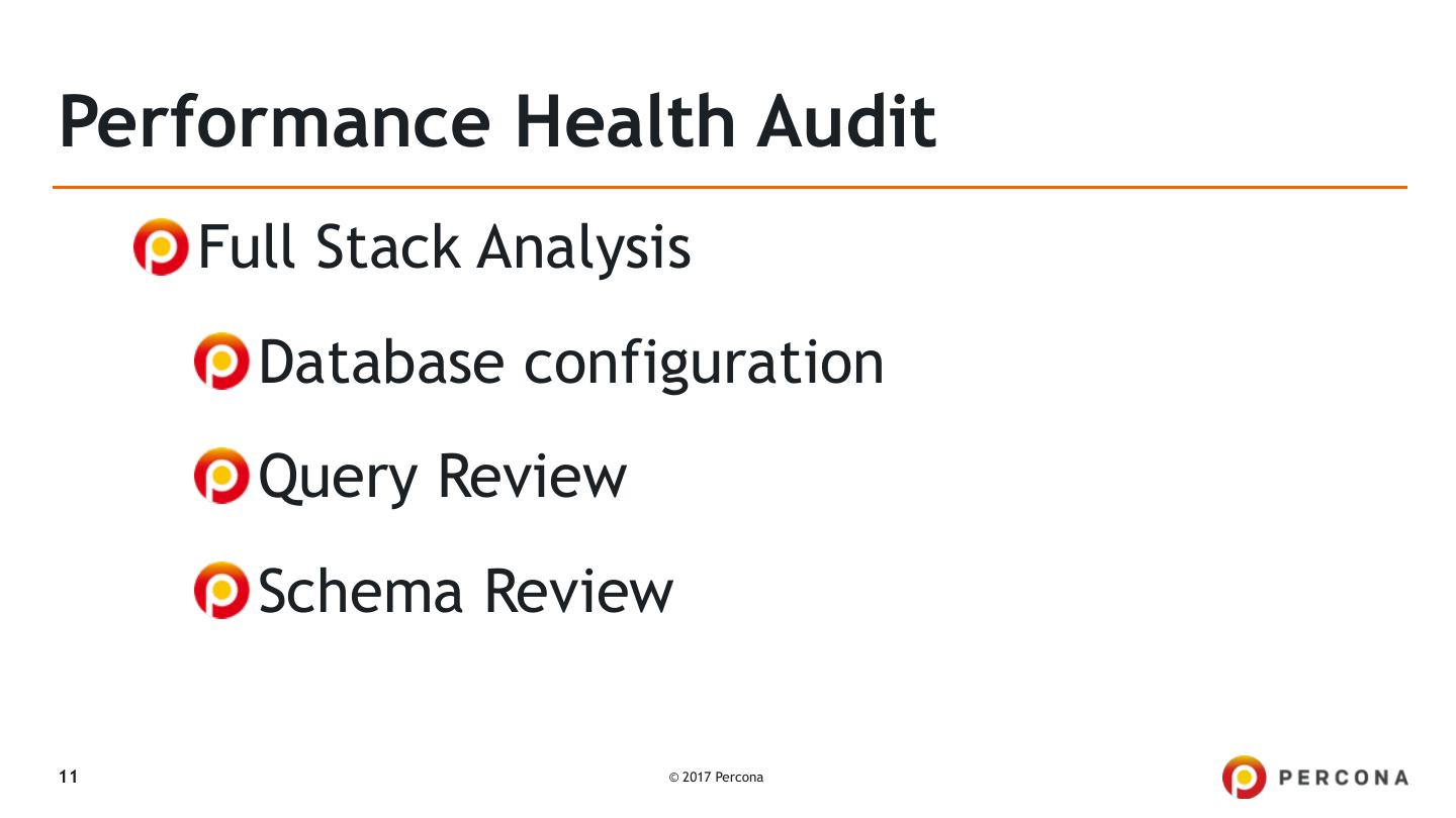 11 .Performance Health Audit Full Stack Analysis Database configuration Query Review Schema Review 11 © 2017 Percona