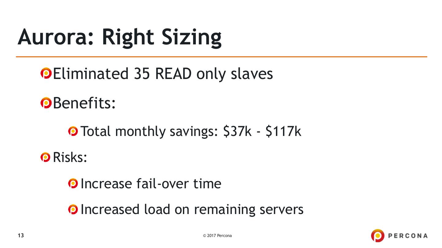 13 .Aurora: Right Sizing Eliminated 35 READ only slaves Benefits: Total monthly savings: $37k - $117k Risks: Increase fail-over time Increased load on remaining servers 13 © 2017 Percona