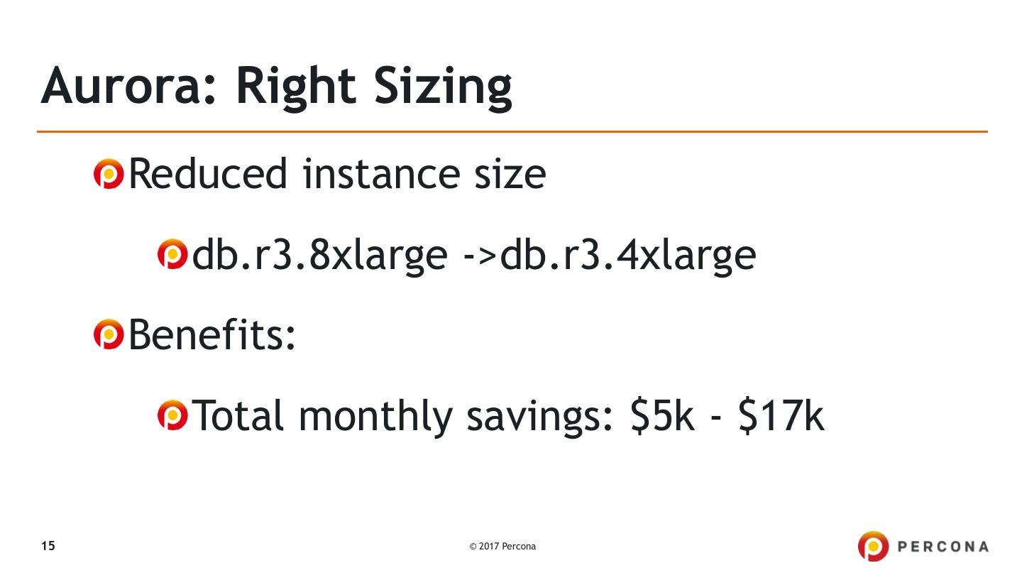 14 .Aurora: Right Sizing Reduced the number of Masters from 35 to 10 Benefits: Total monthly savings: $26k - $84k Risks: Increased load on the remaining masters 14 © 2017 Percona