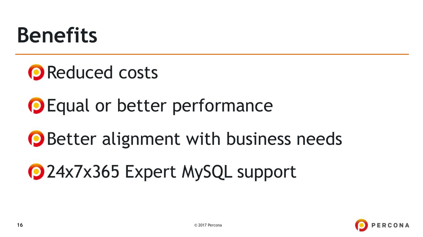 16 .Benefits Reduced costs Equal or better performance Better alignment with business needs 24x7x365 Expert MySQL support 16 © 2017 Percona