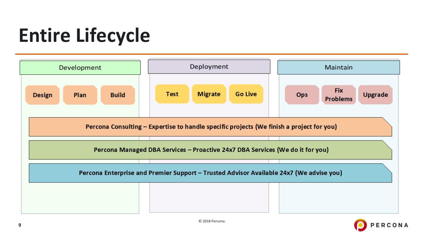 8 .Entire Lifecycle We’re Not Just “Performance Consulting Experts” you call when problems have already happened © 2018 Percona. 8