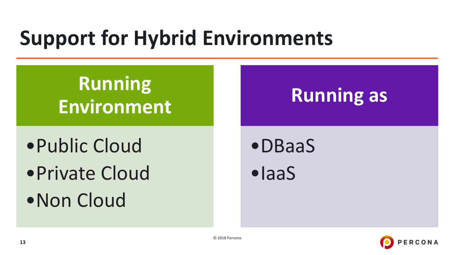 13 .Support for Hybrid Environments Running Running as Environment •Public Cloud •DBaaS •Private Cloud •IaaS •Non Cloud © 2018 Percona. 13