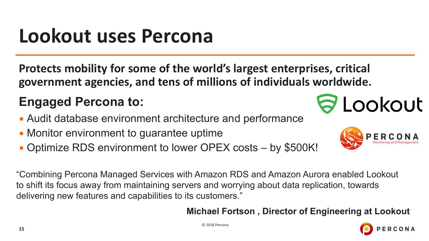 14 .Partnership with AWS • Plan and Execute Migration to the Cloud • Amazon RDS and Aurora Experience • Strong Partnership for Advanced Solutions © 2018 Percona. 14