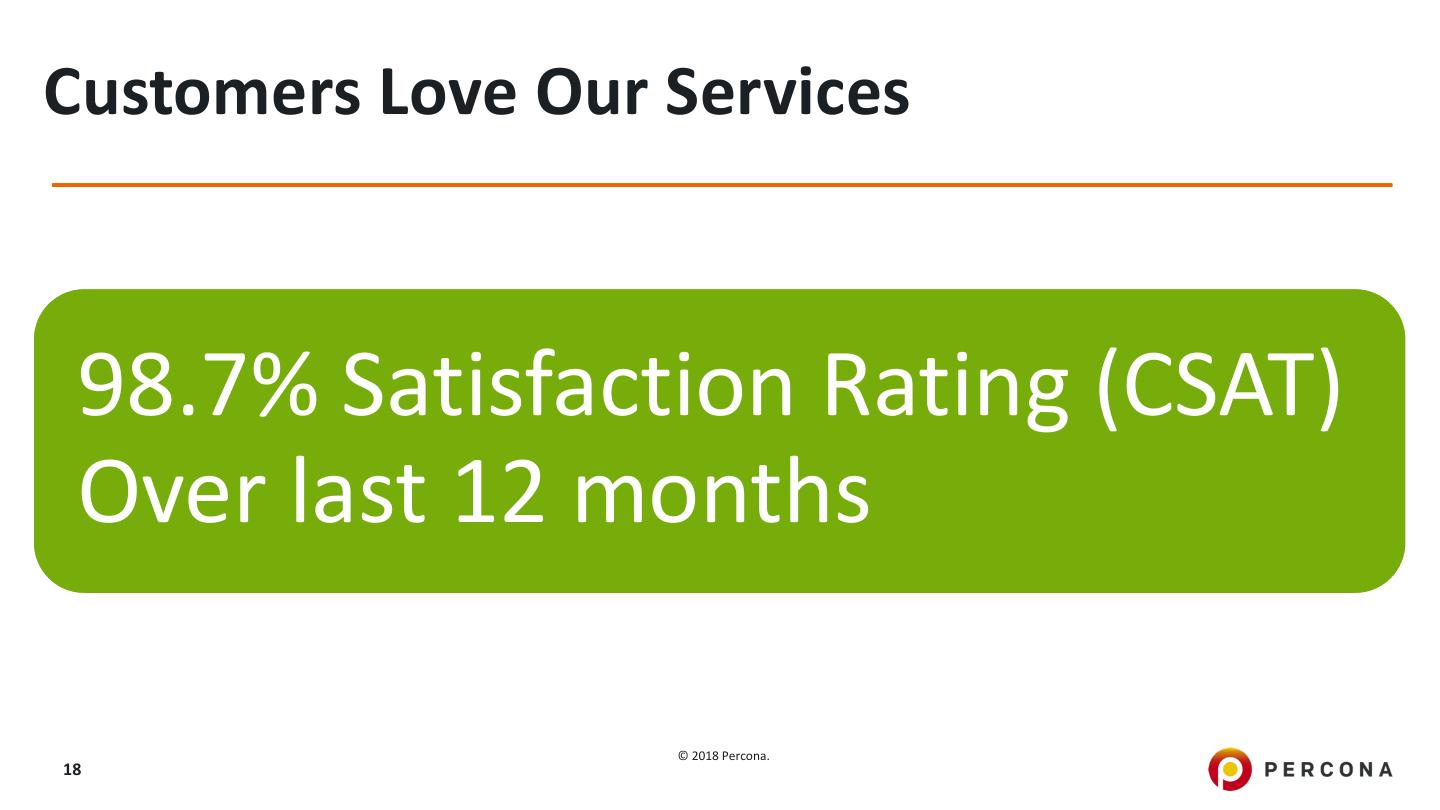 18 .Customers Love Our Services 98.7% Satisfaction Rating (CSAT) Over last 12 months © 2018 Percona. 18
