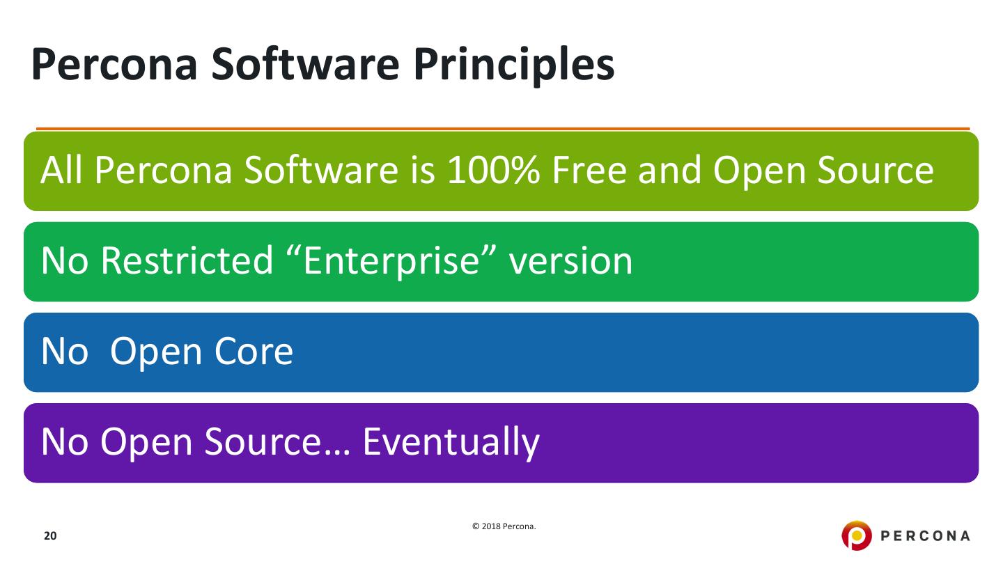 20 .Percona Software Principles All Percona Software is 100% Free and Open Source No Restricted “Enterprise” version No Open Core No Open Source… Eventually © 2018 Percona. 20