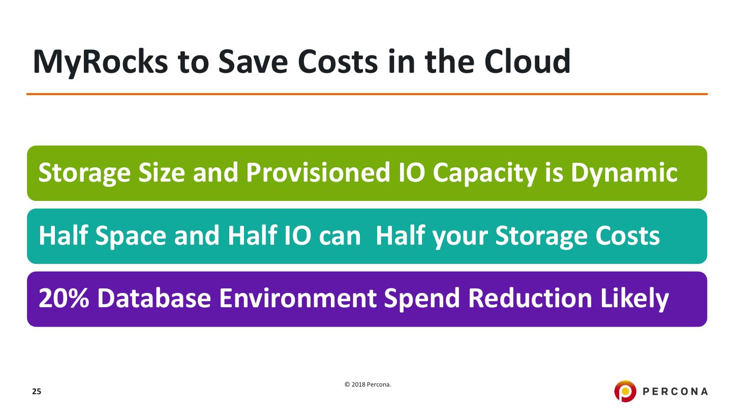 25 .MyRocks to Save Costs in the Cloud Storage Size and Provisioned IO Capacity is Dynamic Half Space and Half IO can Half your Storage Costs 20% Database Environment Spend Reduction Likely © 2018 Percona. 25