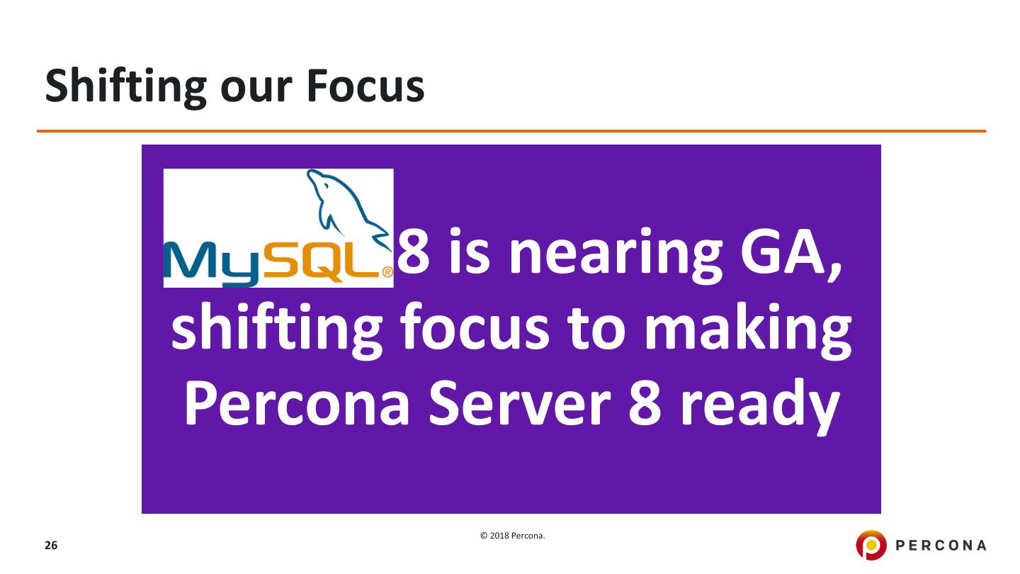 26 .Shifting our Focus MySQL 8 is nearing GA, shifting focus to making Percona Server 8 ready © 2018 Percona. 26