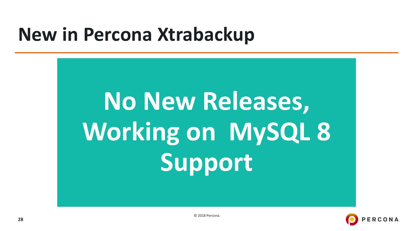 28 .New in Percona Xtrabackup No New Releases, Working on MySQL 8 Support © 2018 Percona. 28