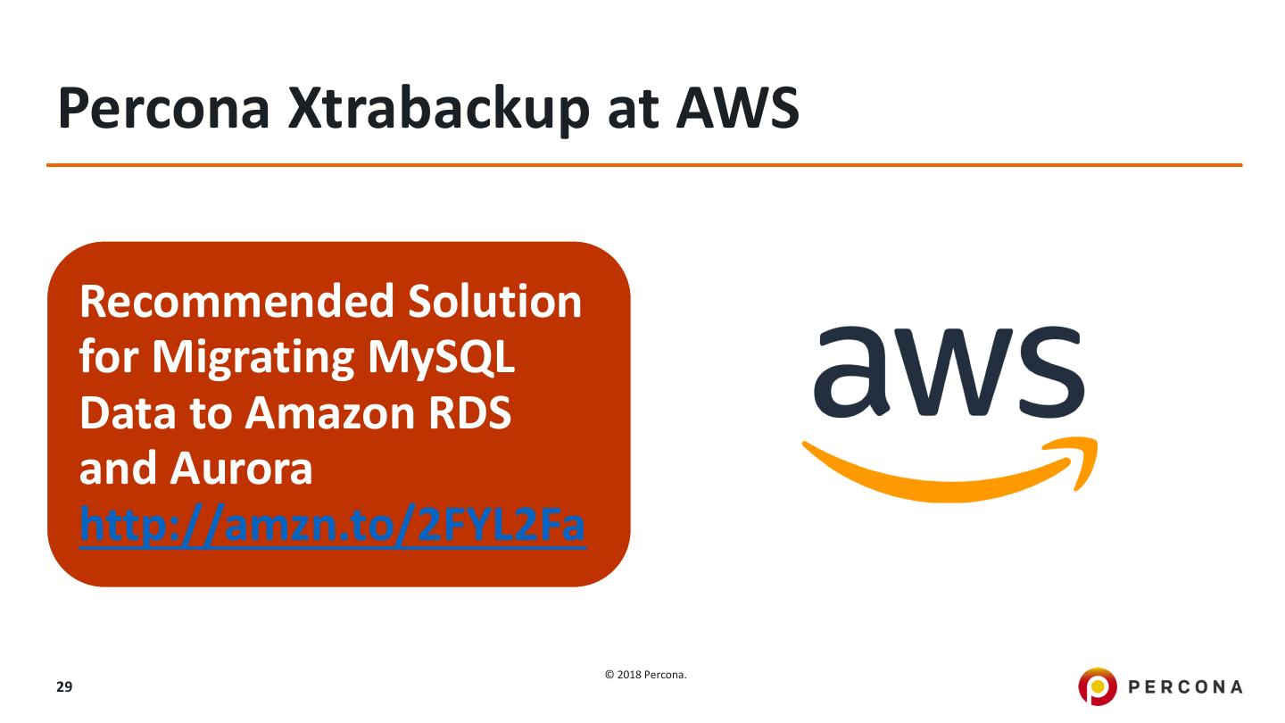 29 .Percona Xtrabackup at AWS Recommended Solution for Migrating MySQL Data to Amazon RDS and Aurora http://amzn.to/2FYL2Fa © 2018 Percona. 29
