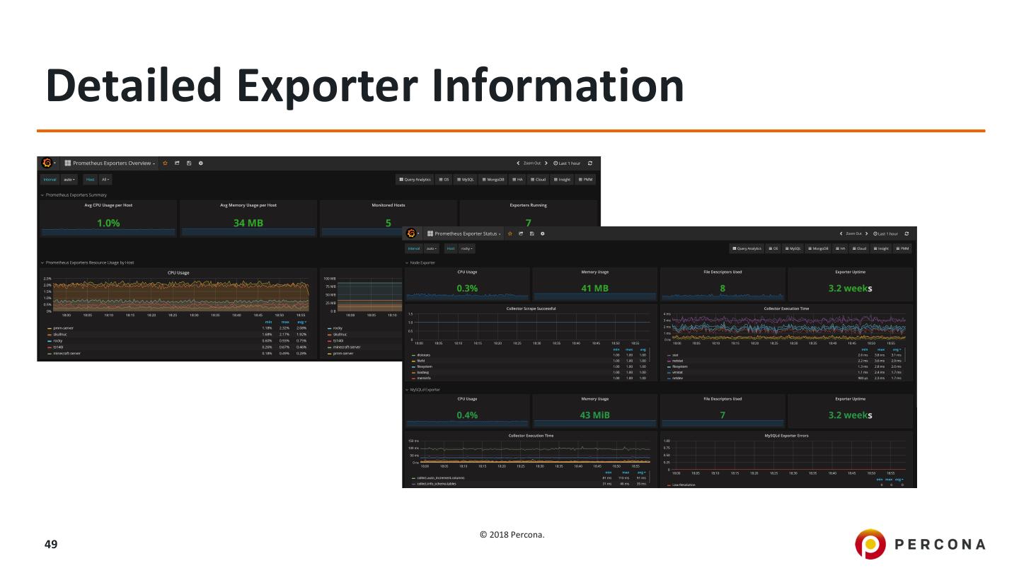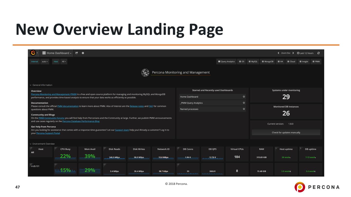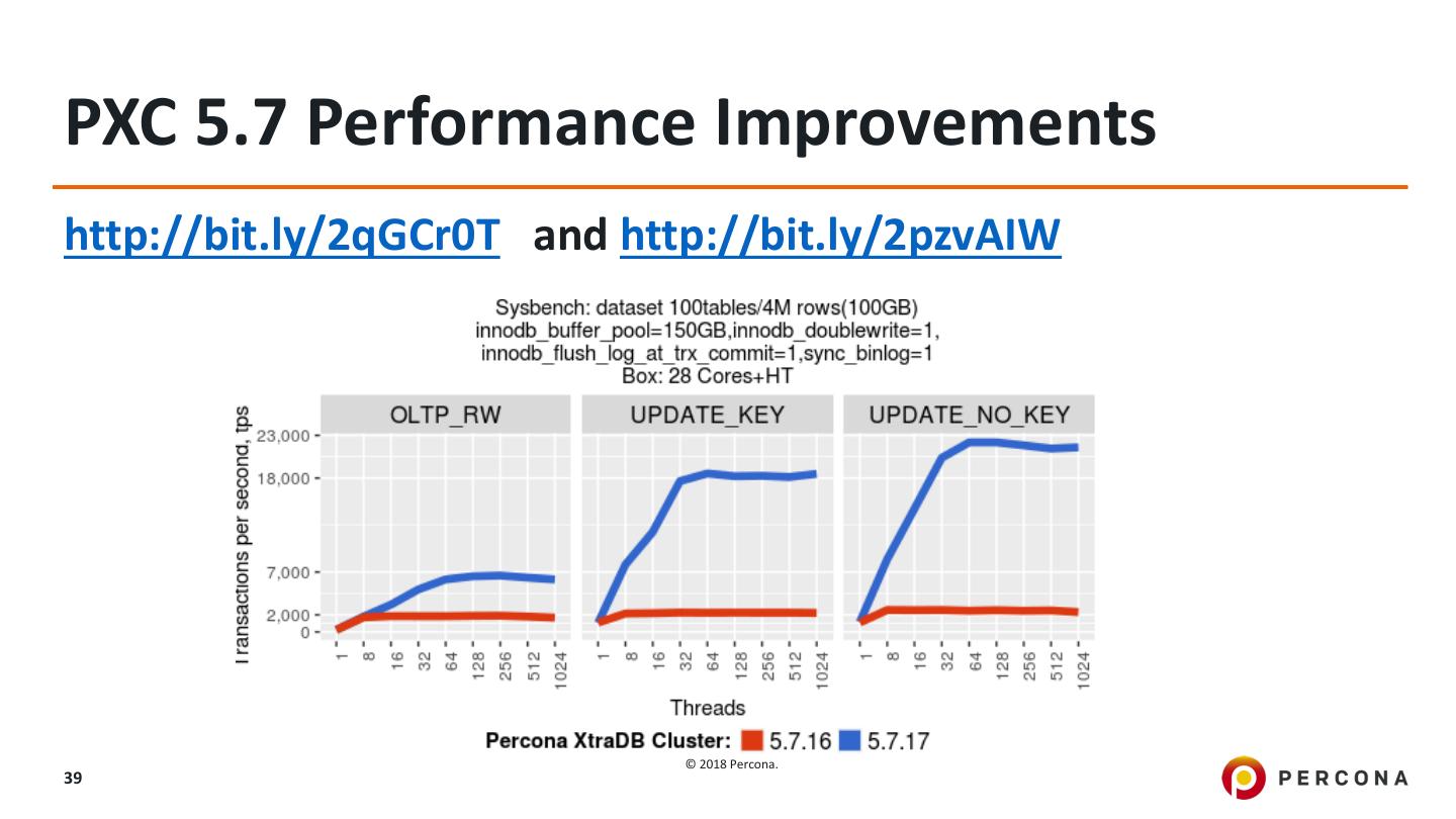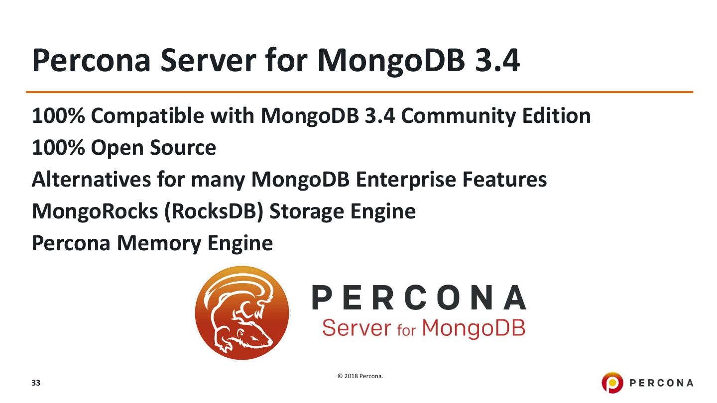 22 .Percona Server for MySQL 5.7 Overview • 100% Compatible with MySQL 5.7 (Community Edition) • Open Source Variants for many MySQL Enterprise Features • Better Performance on High End Workloads • Improved Security and Observability © 2018 Percona. 22