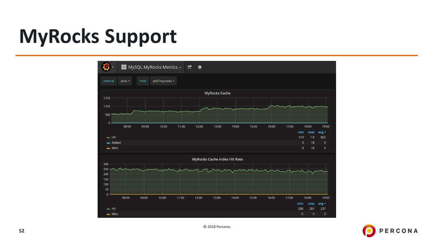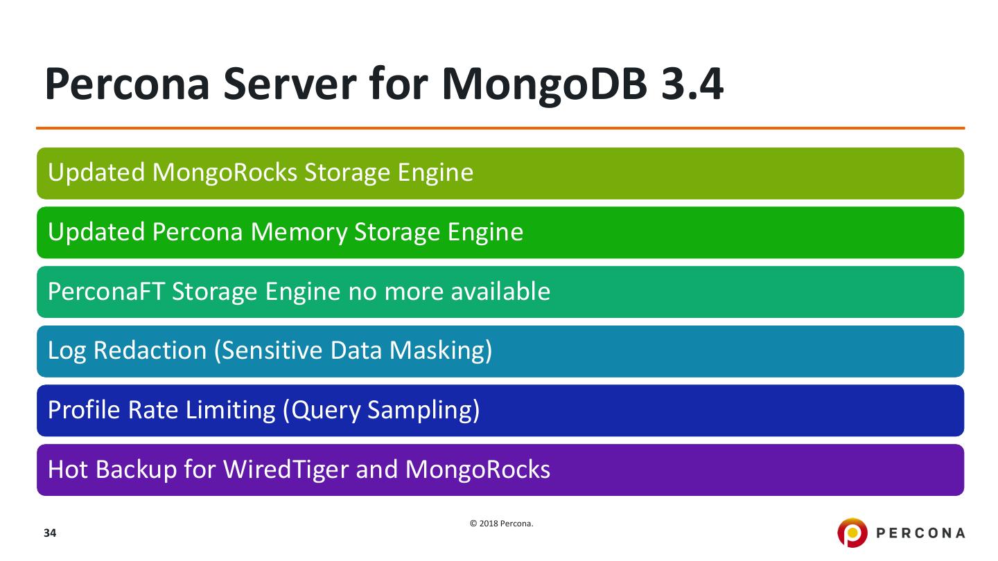 23 .MyRocks is now GA in Percona Server • 3-4x compression compared to Innodb • 10x less write amplification • Faster Data Loading • Faster Replication • http://bit.ly/MyRocks © 2018 Percona. 23