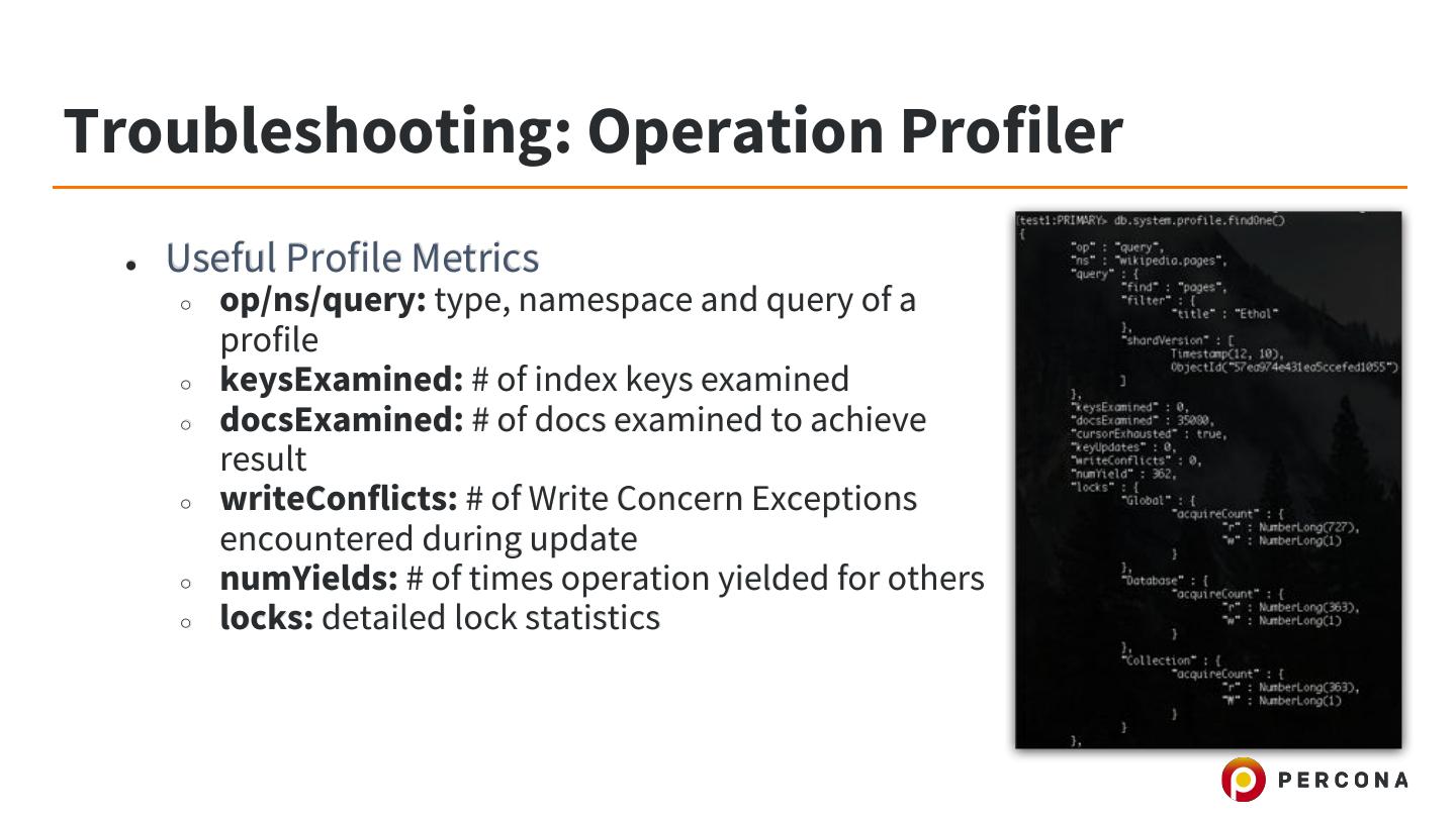 14 .Troubleshooting: Operation Profiler ● Useful Profile Metrics ○ op/ns/query: type, namespace and query of a profile ○ keysExamined: # of index keys examined ○ docsExamined: # of docs examined to achieve result ○ writeConflicts: # of Write Concern Exceptions encountered during update ○ numYields: # of times operation yielded for others ○ locks: detailed lock statistics