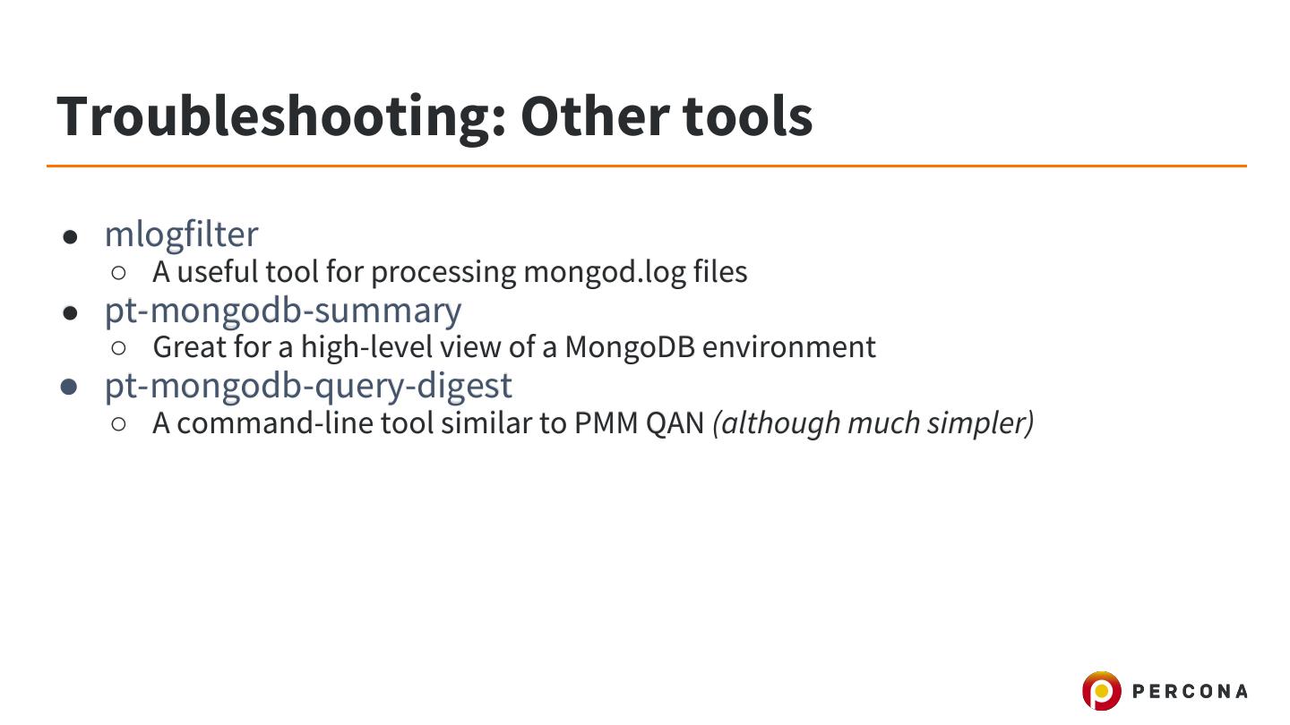 23 .Troubleshooting: Other tools ● mlogfilter ○ A useful tool for processing mongod.log files ● pt-mongodb-summary ○ Great for a high-level view of a MongoDB environment ● pt-mongodb-query-digest ○ A command-line tool similar to PMM QAN (although much simpler)