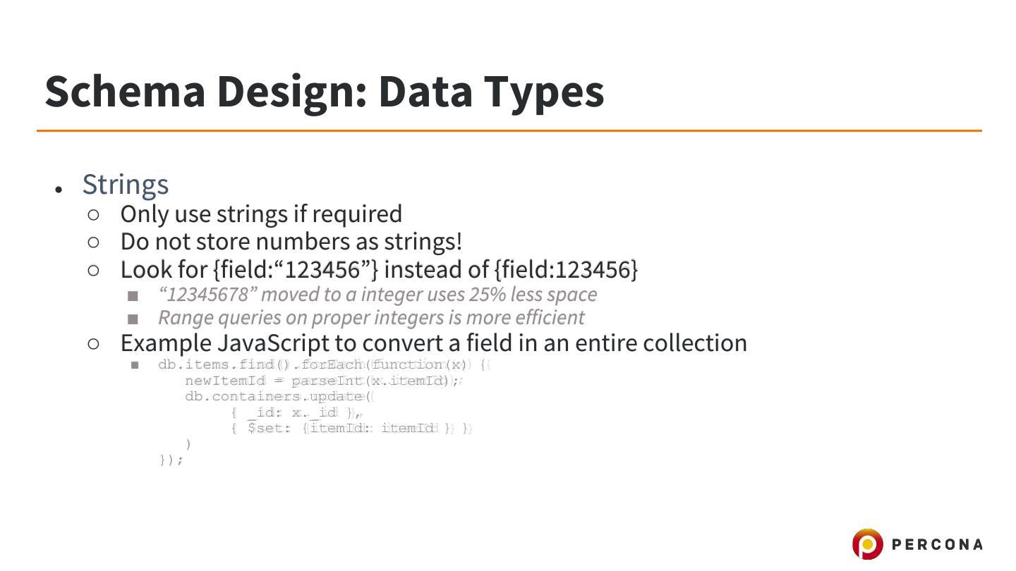 25 .Schema Design: Data Types ● Strings ○ Only use strings if required ○ Do not store numbers as strings! ○ Look for {field:“123456”} instead of {field:123456} ■ “12345678” moved to a integer uses 25% less space ■ Range queries on proper integers is more efficient ○ Example JavaScript to convert a field in an entire collection ■ db.items.find().forEach(function(x) { newItemId = parseInt(x.itemId); db.containers.update( { _id: x._id }, { $set: {itemId: itemId } } ) });