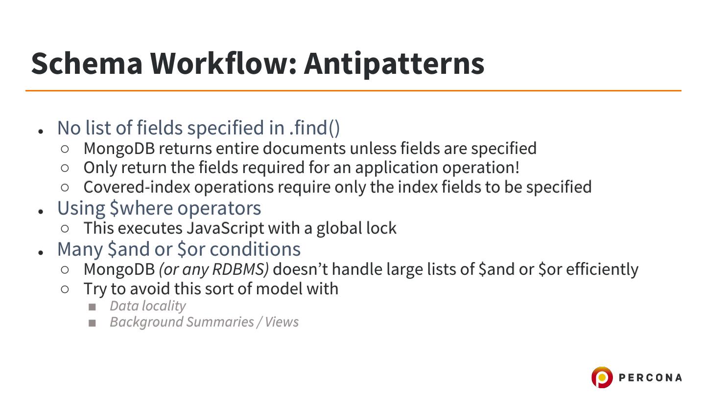28 .Schema Design: Indexes ● Avoid drivers that auto-create indexes ○ Use real performance data to make indexing decisions, find out before Production! ● Too many indexes hurts write performance for an entire collection ● Indexes have a forward or backward direction ○ Try to cover .sort() with index and match direction!