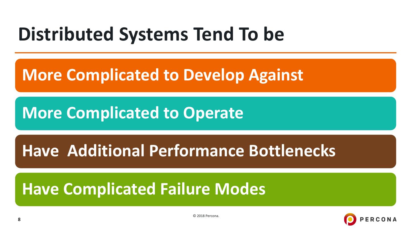 8 .Distributed Systems Tend To be More Complicated to Develop Against More Complicated to Operate Have Additional Performance Bottlenecks Have Complicated Failure Modes © 2018 Percona. 8